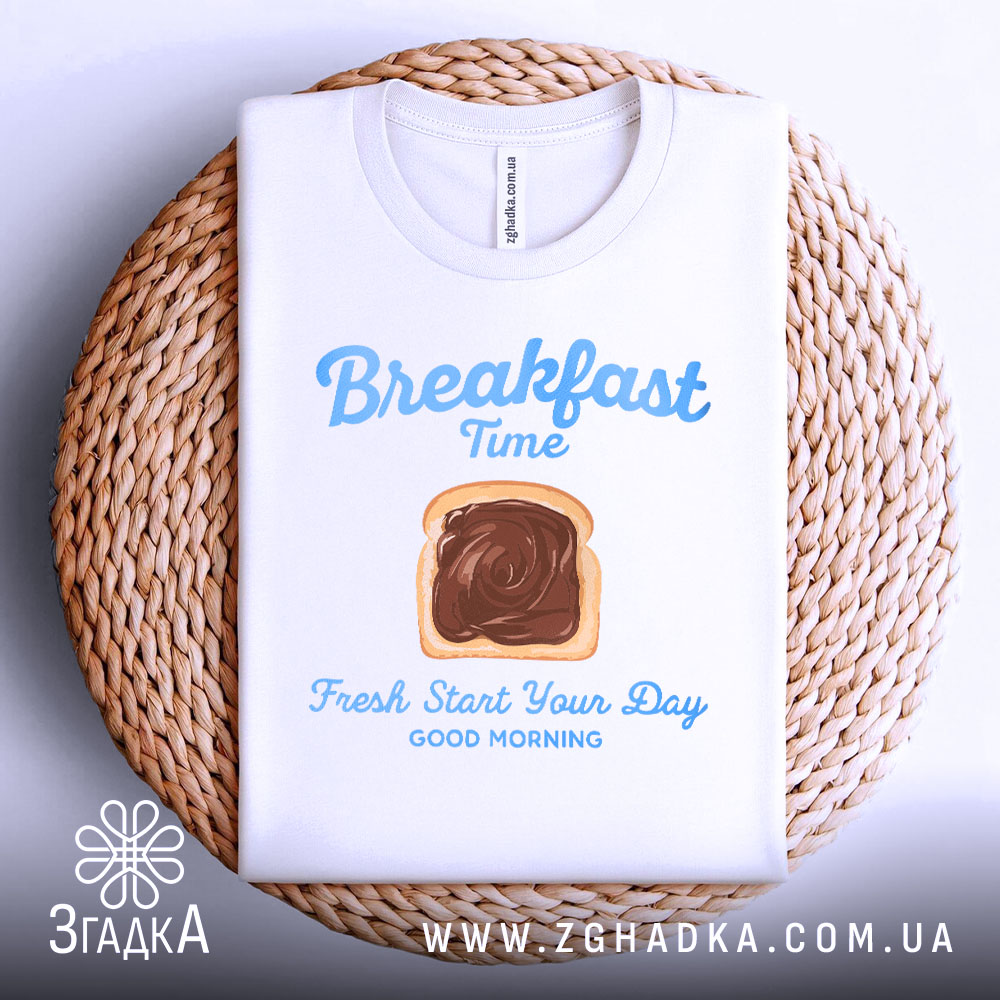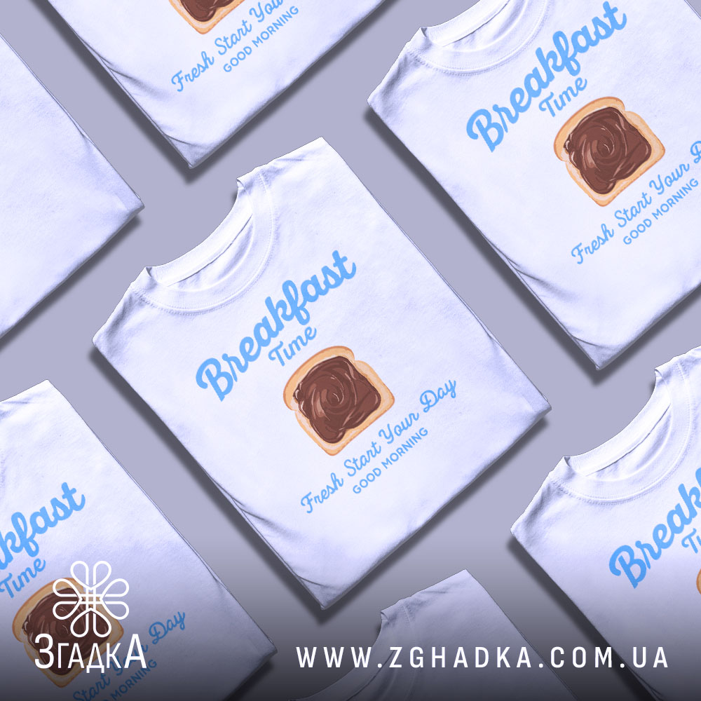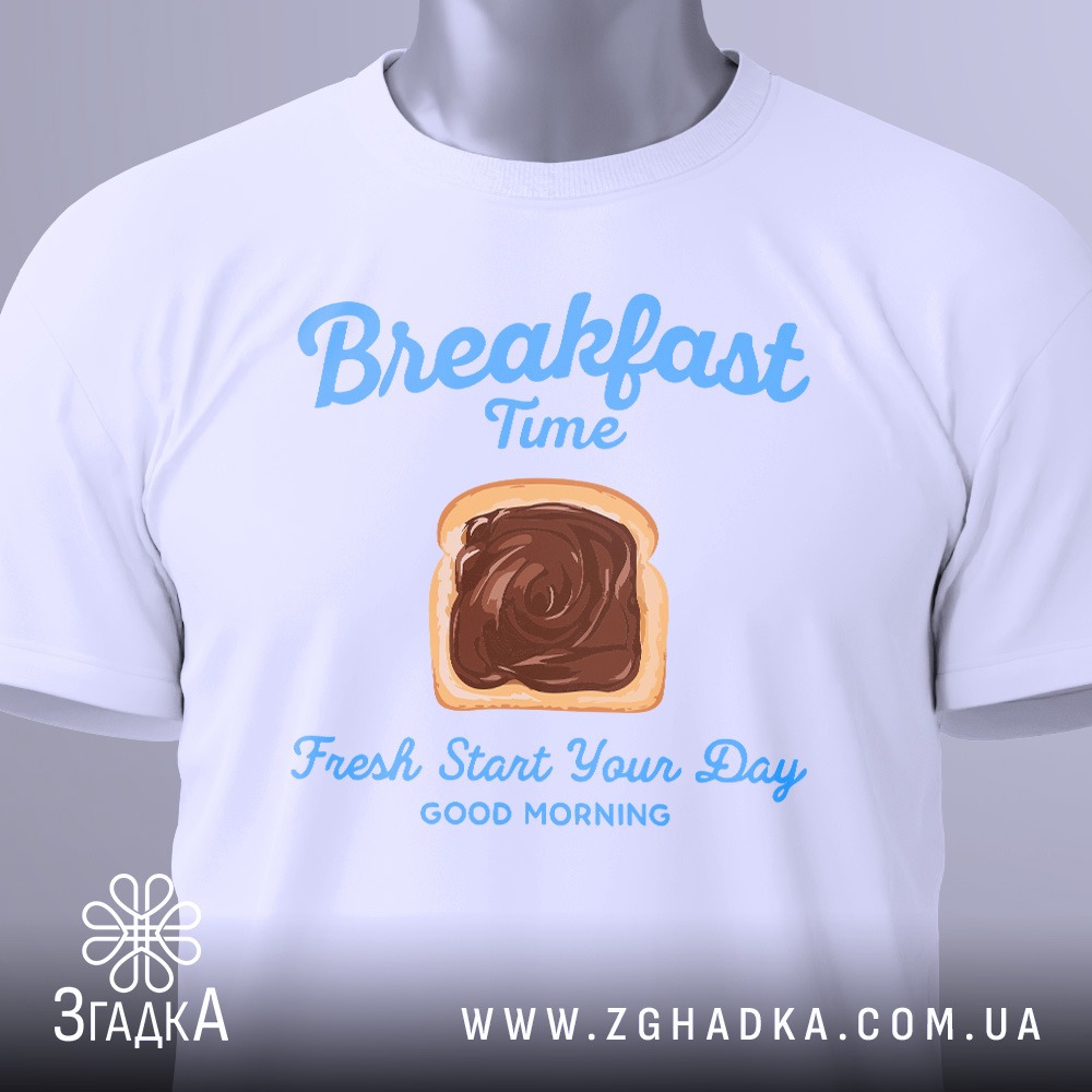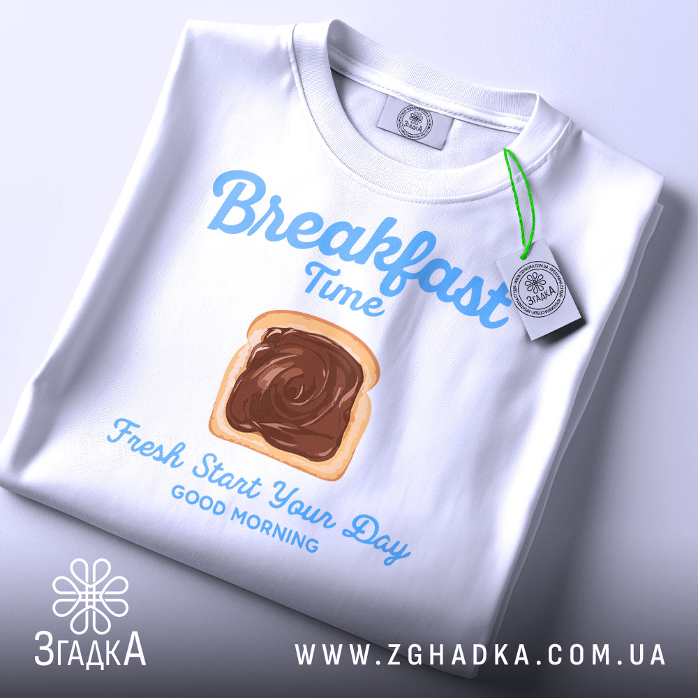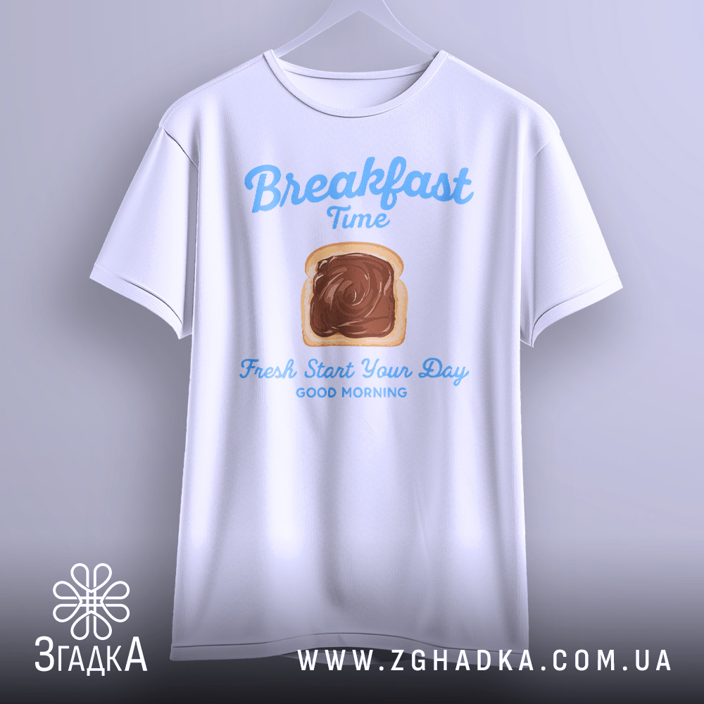 Ця футболка виготовлена з високоякісних матеріалів, що забезпечують комфорт і стиль. Принт з сніданком нагадує про важливість кожного нового дня та надихає на позитивні зміни.