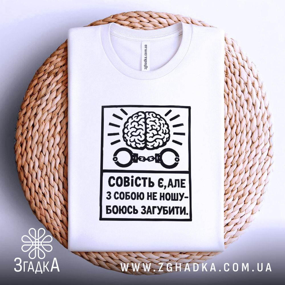Ця футболка виготовлена з якісних матеріалів і має оригінальний принт, що символізує важливість совісті в нашому житті. Вона стане не лише стильним, а й змістовним елементом вашого образу.