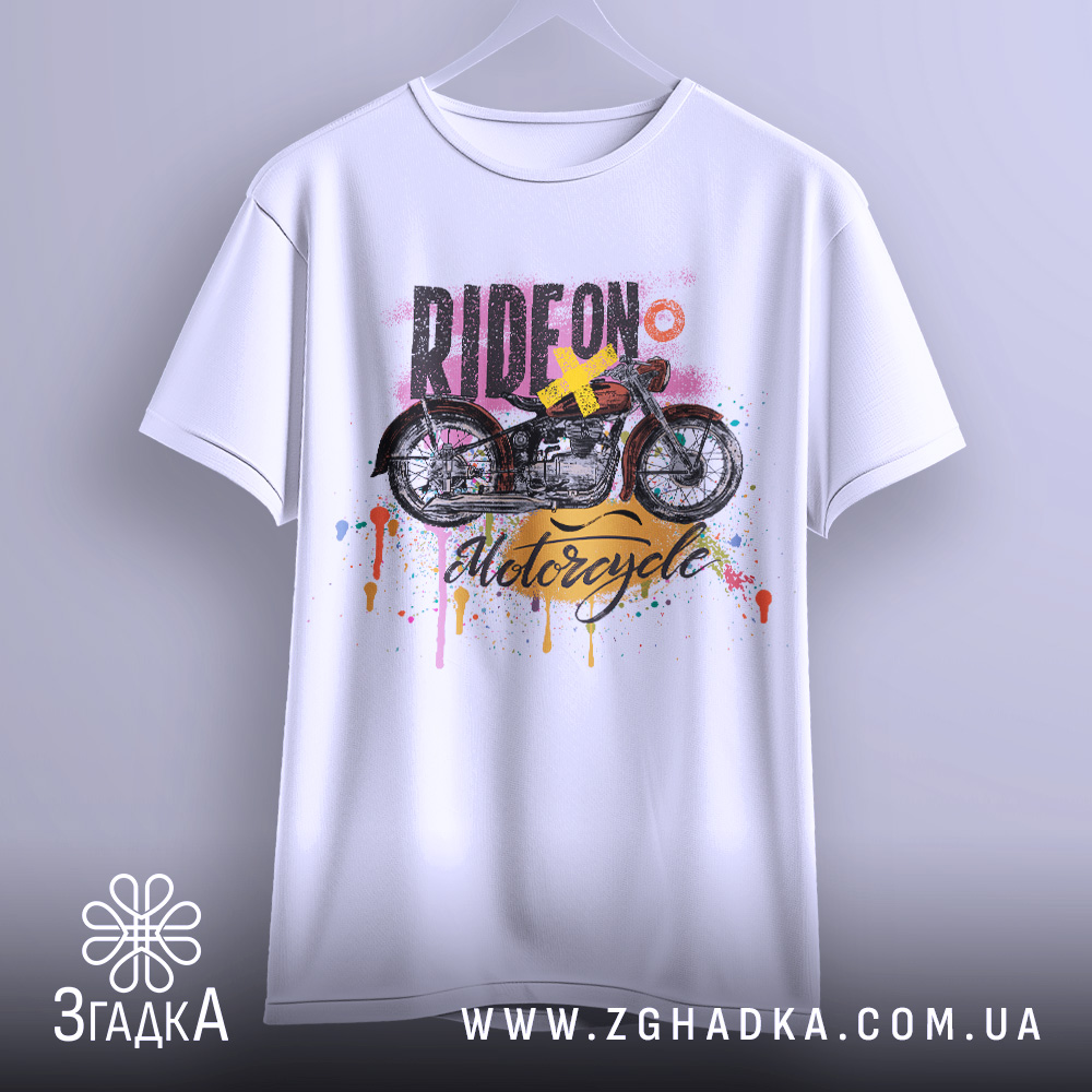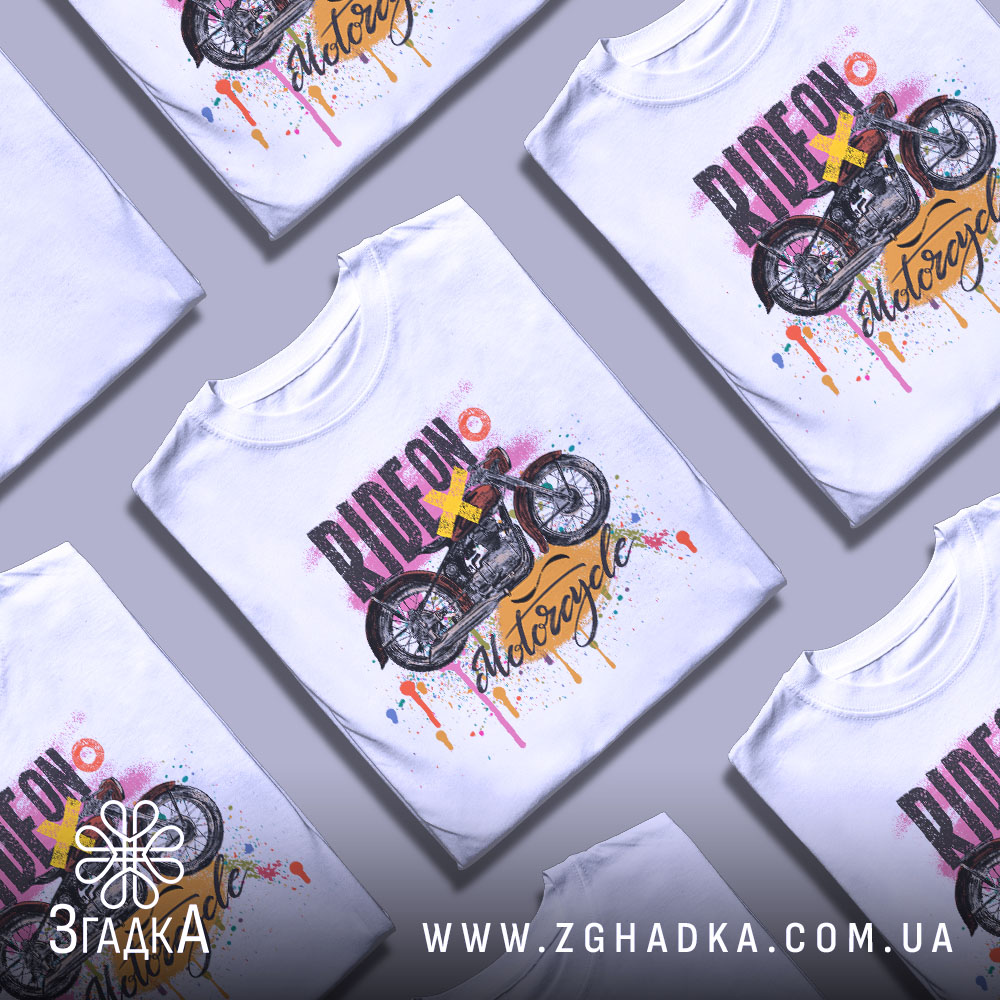 На принті зображено мотоцикл, що символізує свободу та адреналін. Ця футболка створена для тих, хто цінує стиль та комфорт. Додайте до свого гардеробу елемент, який підкреслить вашу індивідуальність!