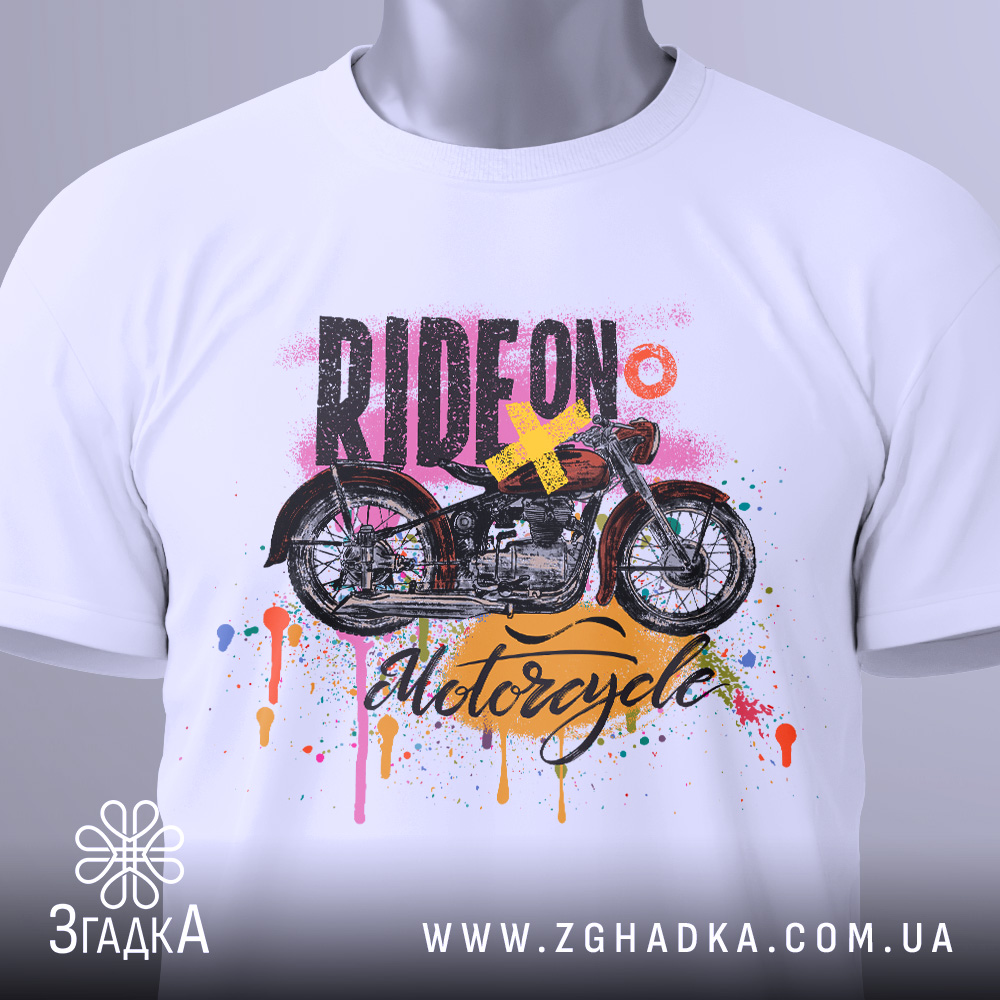 Ця футболка виготовлена з високоякісних матеріалів, що забезпечують комфорт і стиль. Принт на футболці відображає дух мотоциклізму, закликаючи до пригод та нових вражень. Вона стане чудовим доповненням до вашого повсякденного образу.