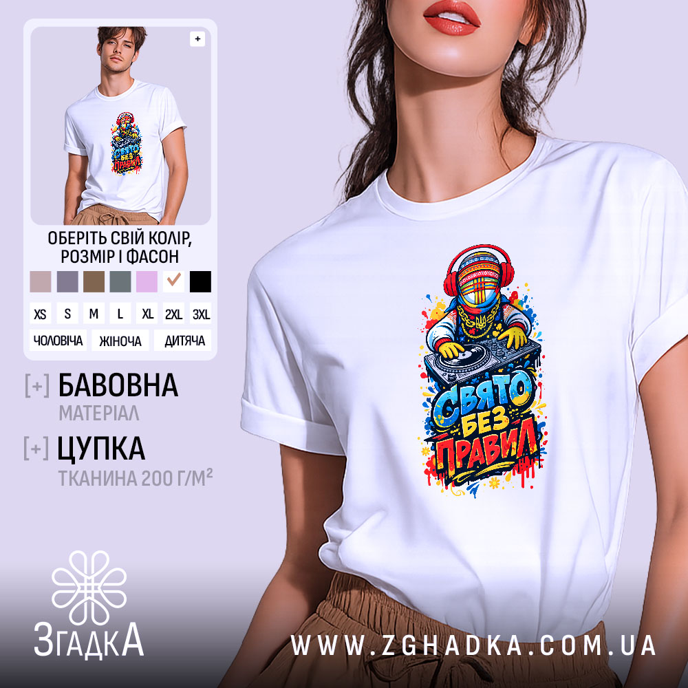 Футболка свято без правил — це ідеальний вибір для тих, хто цінує стиль і комфорт. Вона стане яскравим акцентом у вашому гардеробі.