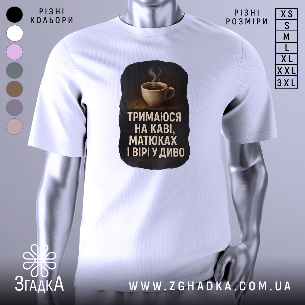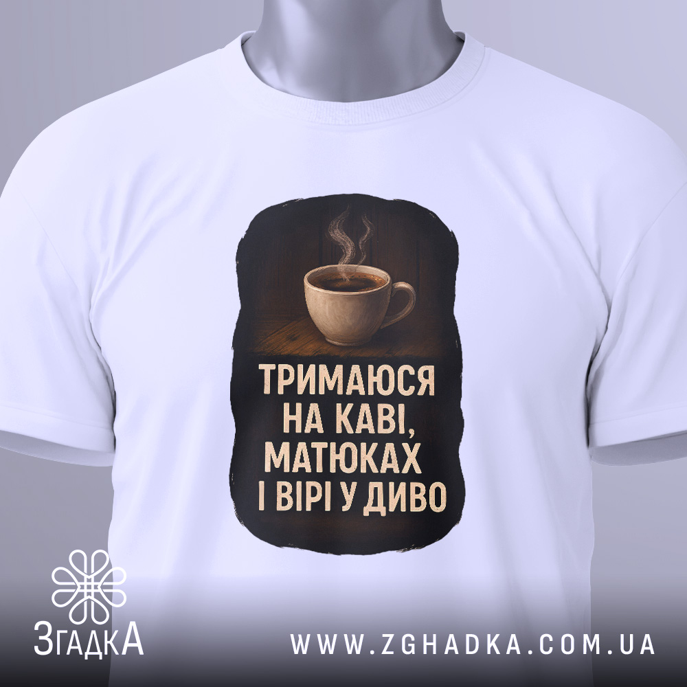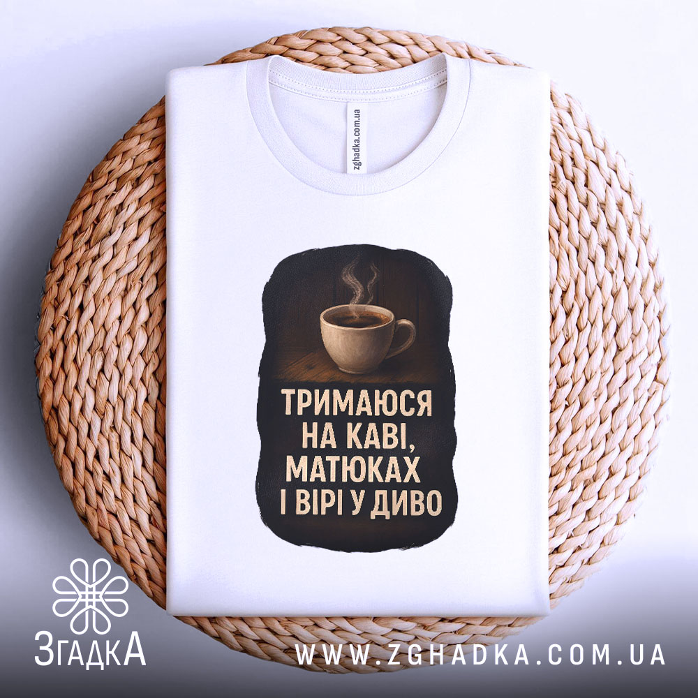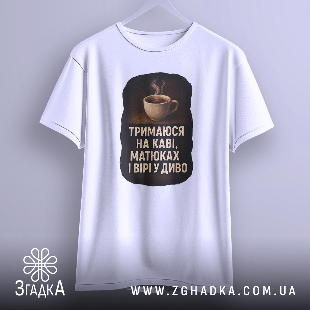 Футболка тримаюся на каві – ідеальний вибір для любителів кави. Стильний принт та комфортний матеріал роблять її незамінною в гардеробі.