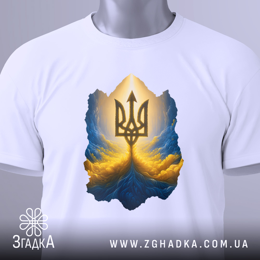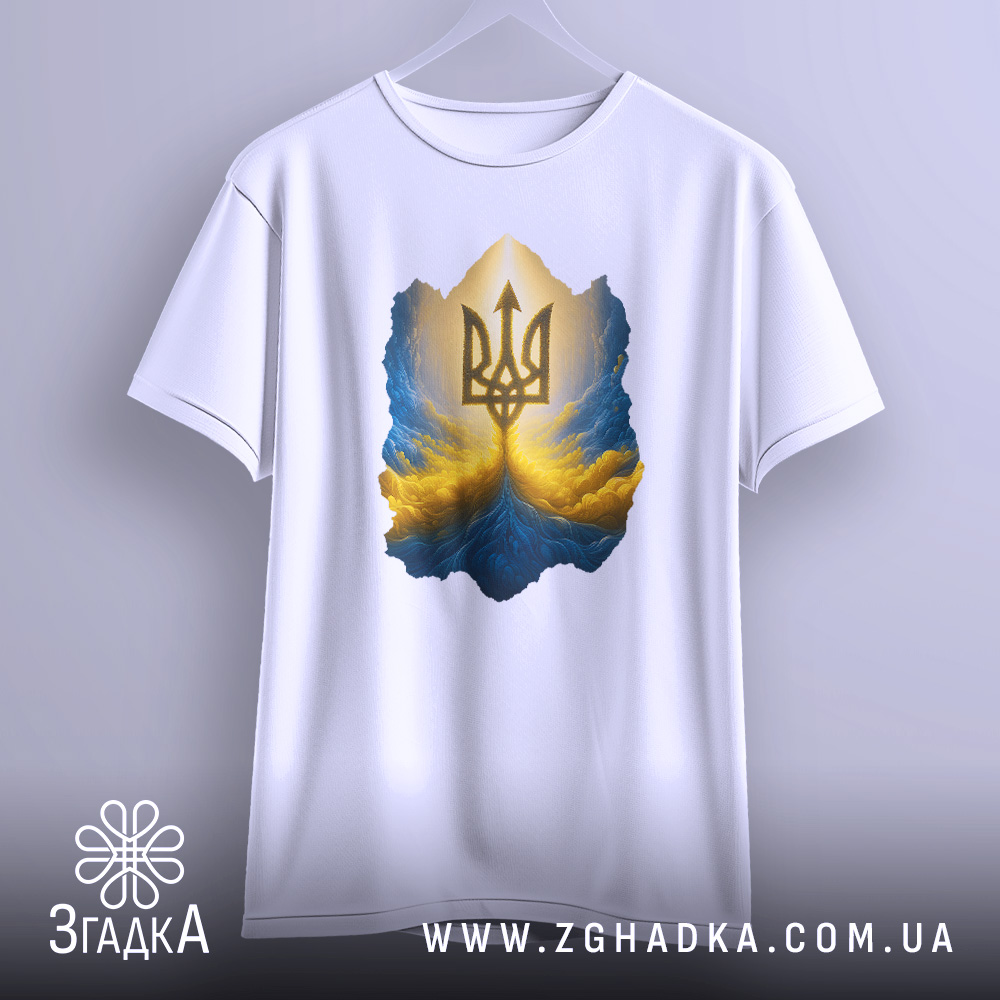 Ця футболка прикрашена вишуканим принтом тризуба в золотих відтінках, що символізує силу та незалежність. Відчуйте гордість за свою країну, носіть її з упевненістю!