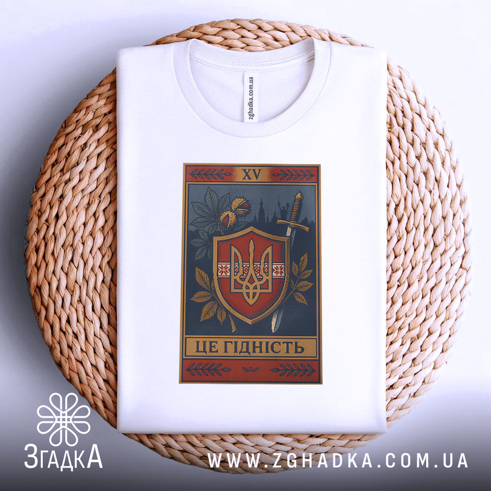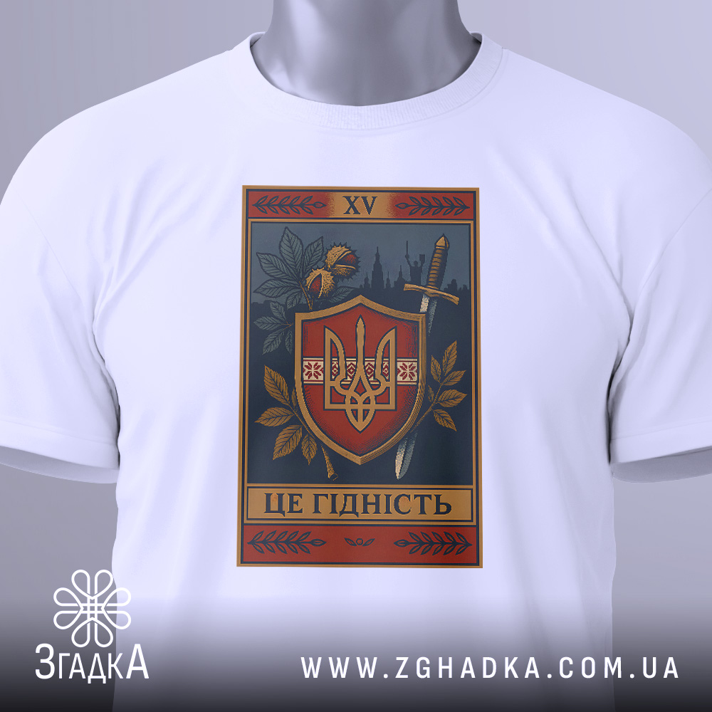 Ця футболка виготовлена з якісних матеріалів, що забезпечують комфорт протягом усього дня. Принт символізує гідність, що робить її ідеальним вибором для тих, хто цінує своє самовираження.