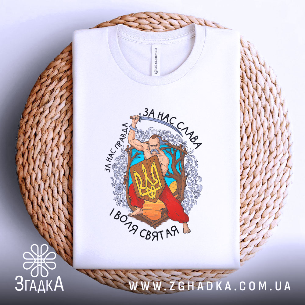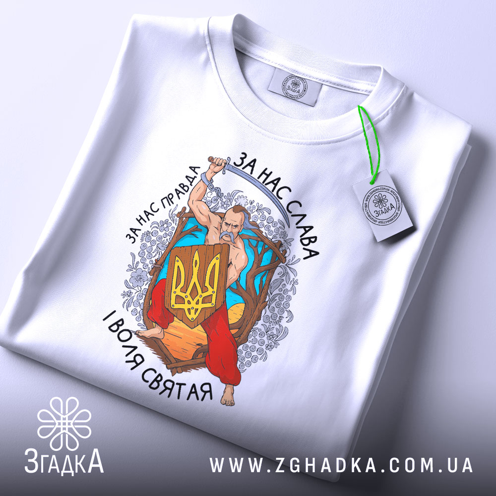Ця футболка виготовлена з якісних матеріалів і має унікальний принт з українським козаком, що символізує силу та незалежність. Вона стане чудовим доповненням до вашого стилю, підкреслюючи вашу любов до рідної землі.