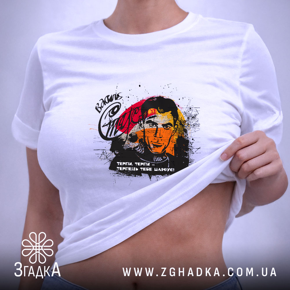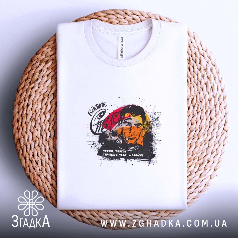 Яскравий принт, що поєднує образ Василя Стуса з емоційним написом. Відтінки червоного, жовтого та чорного створюють динамічну композицію. Текст “Терпи, терпи — терпець тебе шліфує!!” підкреслює силу духу та непокірність.