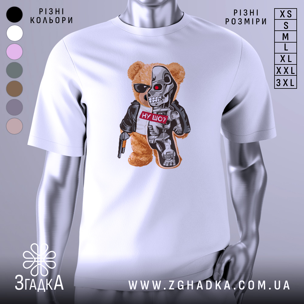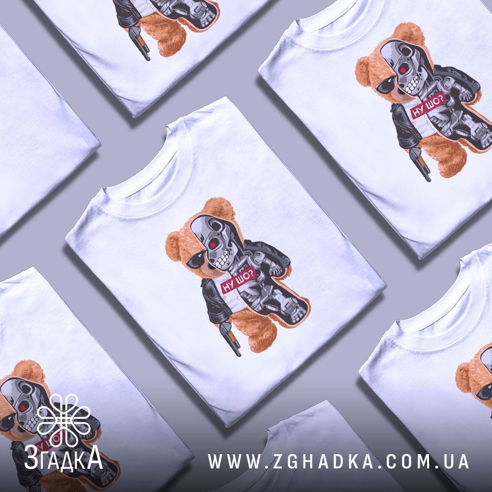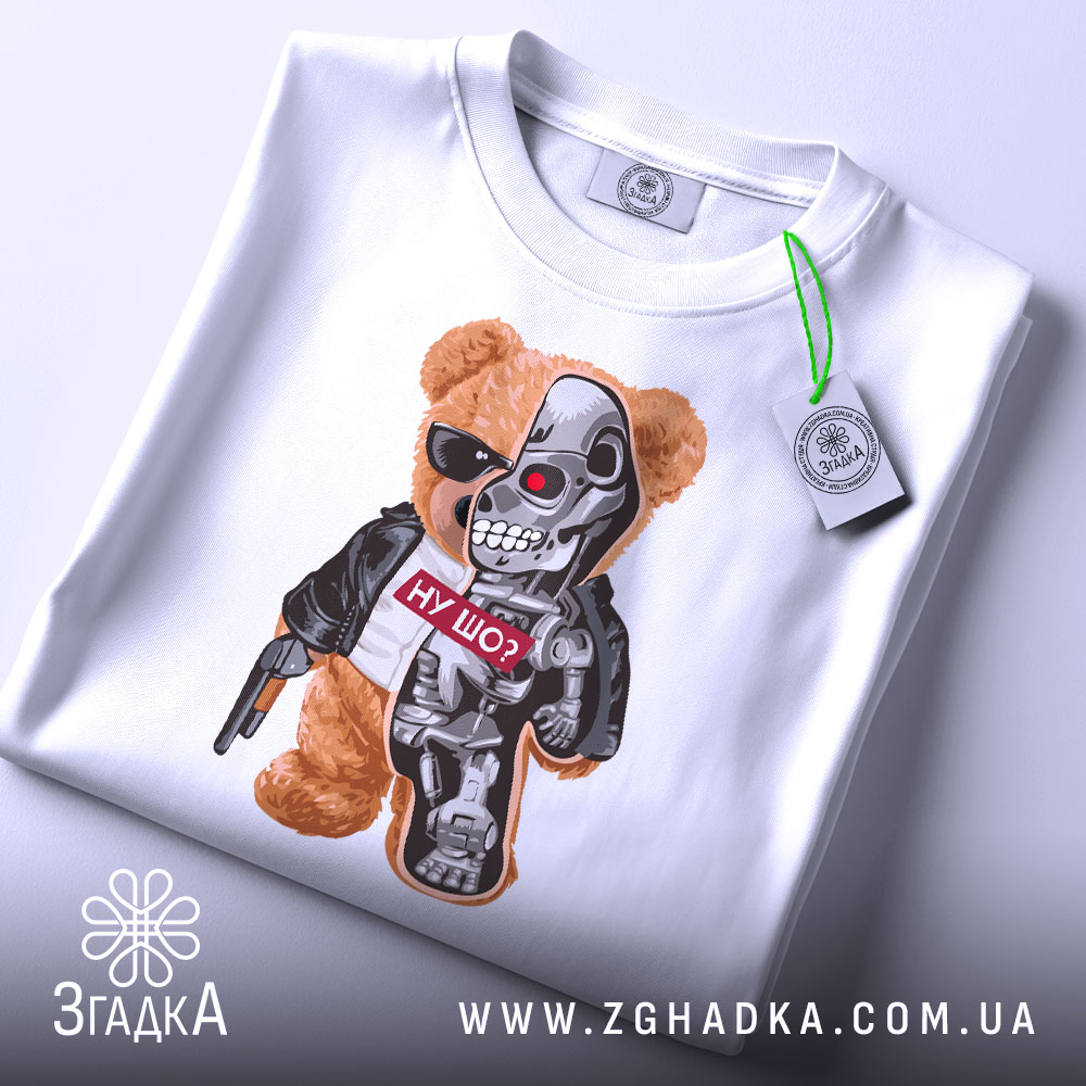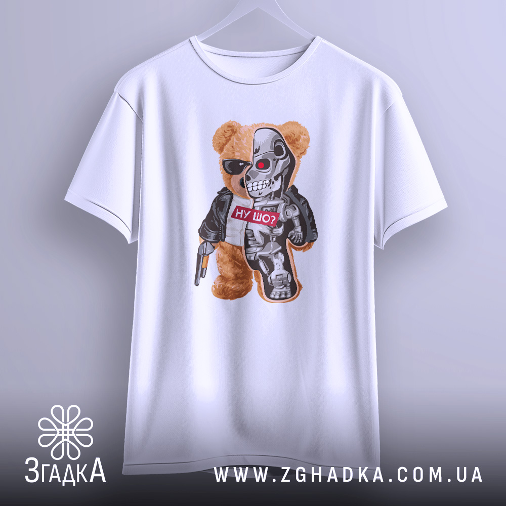 Ця футболка з принтом ведмедя-термінатора поєднує в собі гумор і стиль. Вона створена для тих, хто любить виділятися. Не пропустіть шанс додати цю оригінальну річ у свій гардероб!