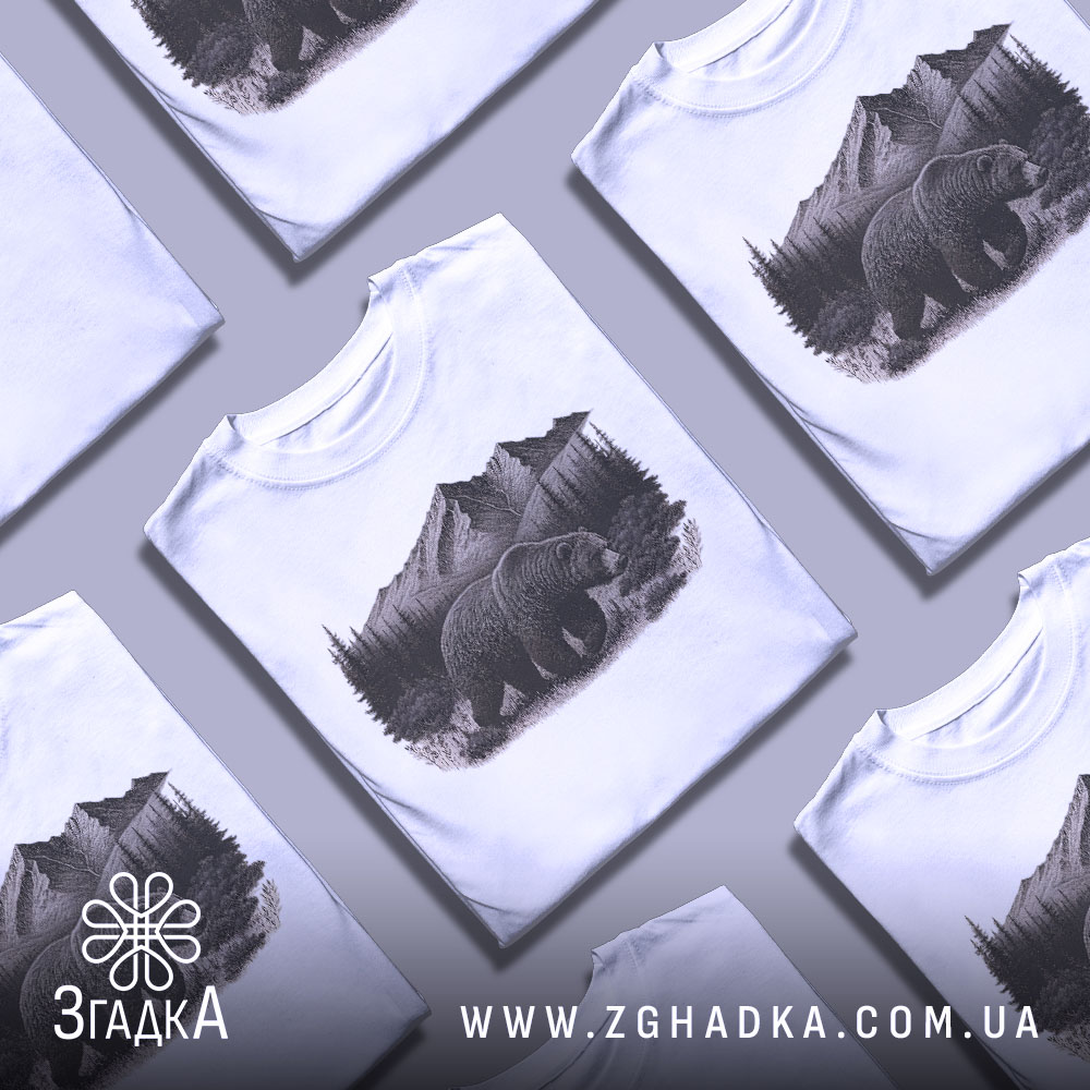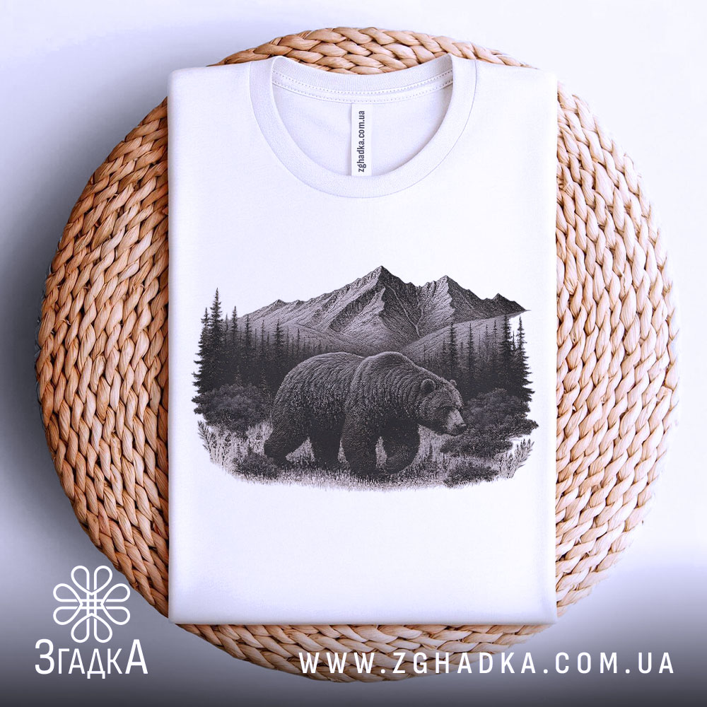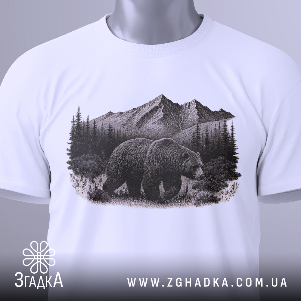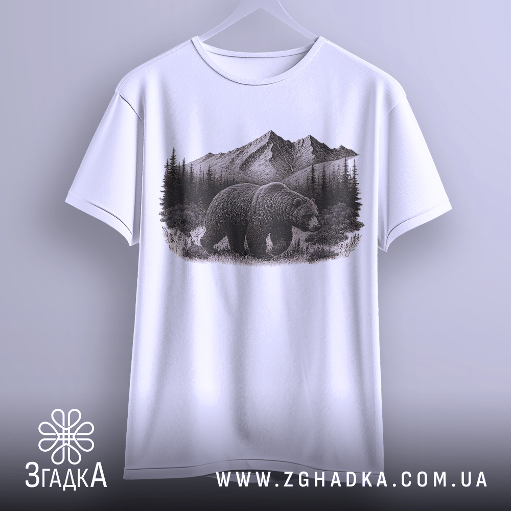 Ця футболка виготовлена з високоякісних матеріалів і має унікальний принт ведмедя на фоні гір. Він символізує силу та незалежність, а також закликає до дослідження нових горизонтів.