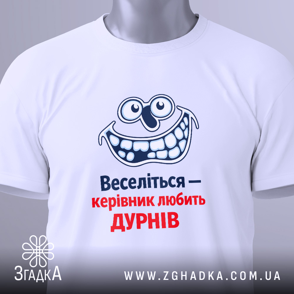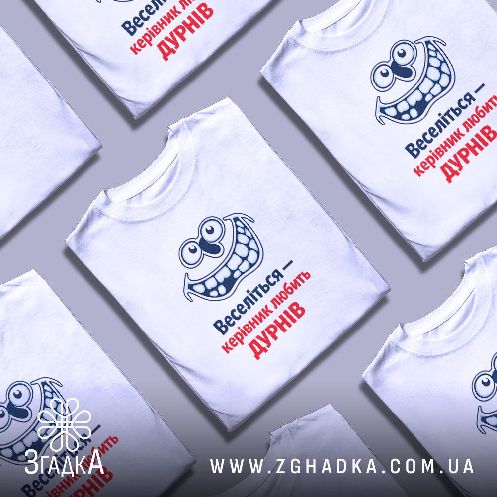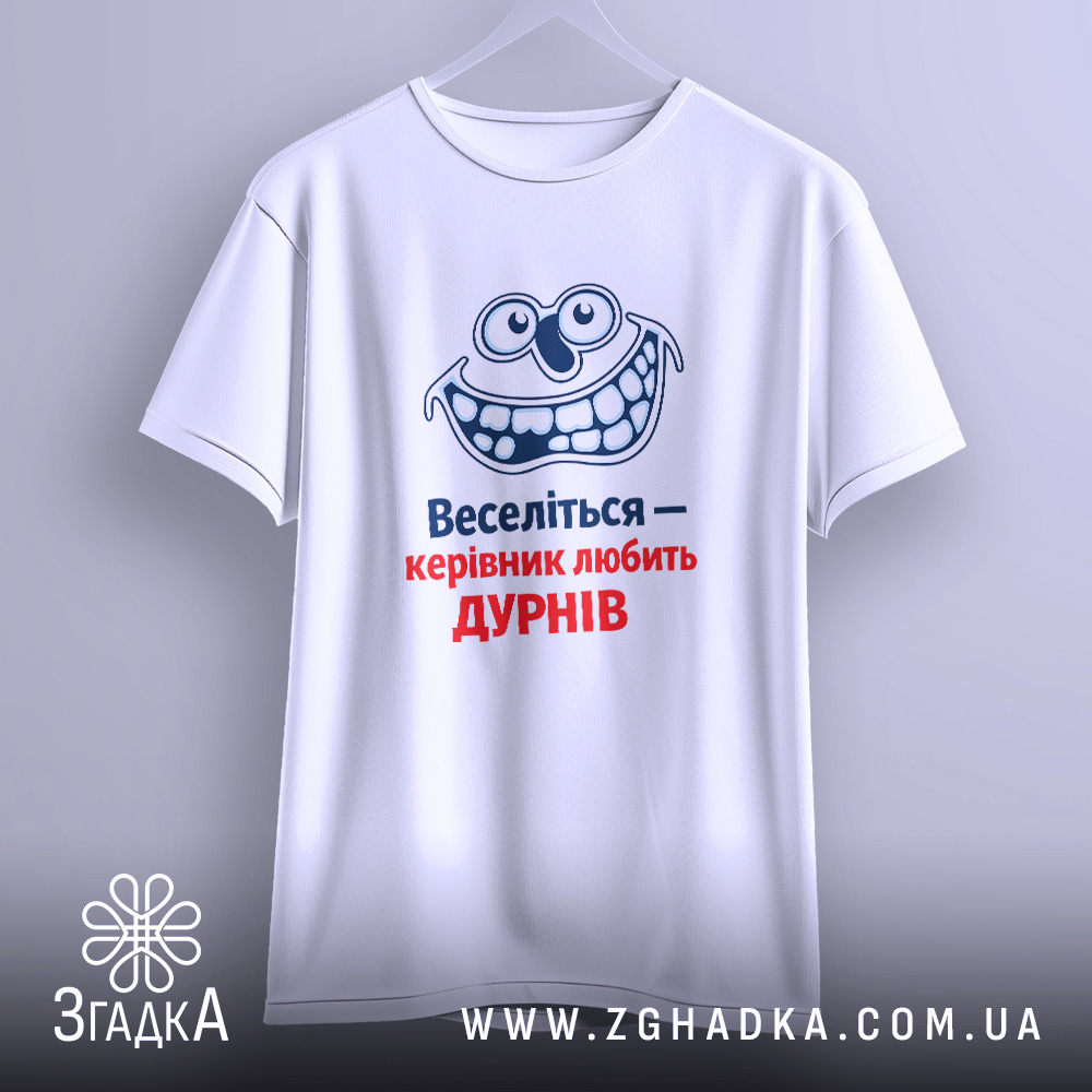 Ця футболка з принтом ‘веселий керівник’ створює позитивну атмосферу. Яскравий стиль та гумор піднімуть настрій вам та оточуючим. Замовте зараз і станьте центром уваги!