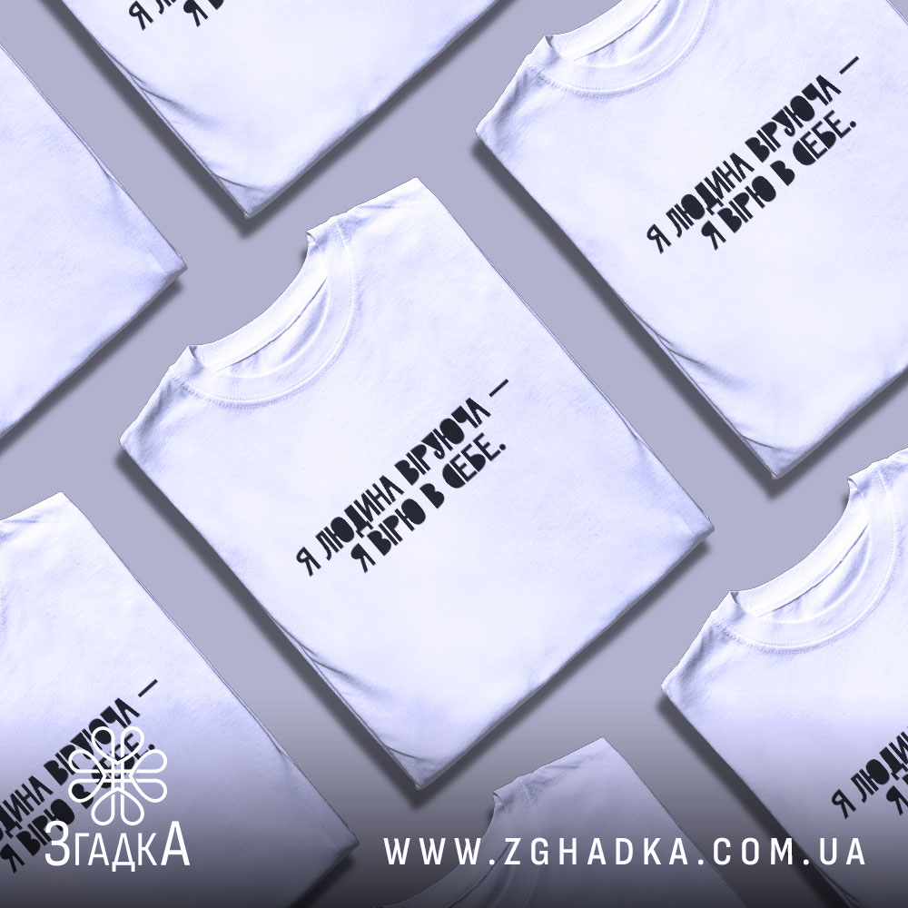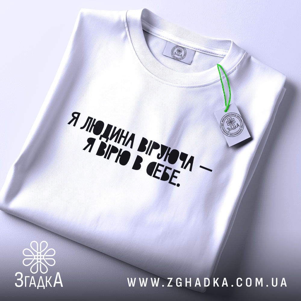 Ця футболка створена для тих, хто вірить у свої сили. Принт ‘Віра в себе’ символізує впевненість та мотивацію, що надихає на досягнення нових висот. Вона стане чудовим доповненням до вашого гардеробу, підкреслюючи вашу індивідуальність.