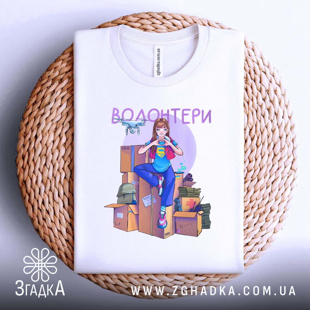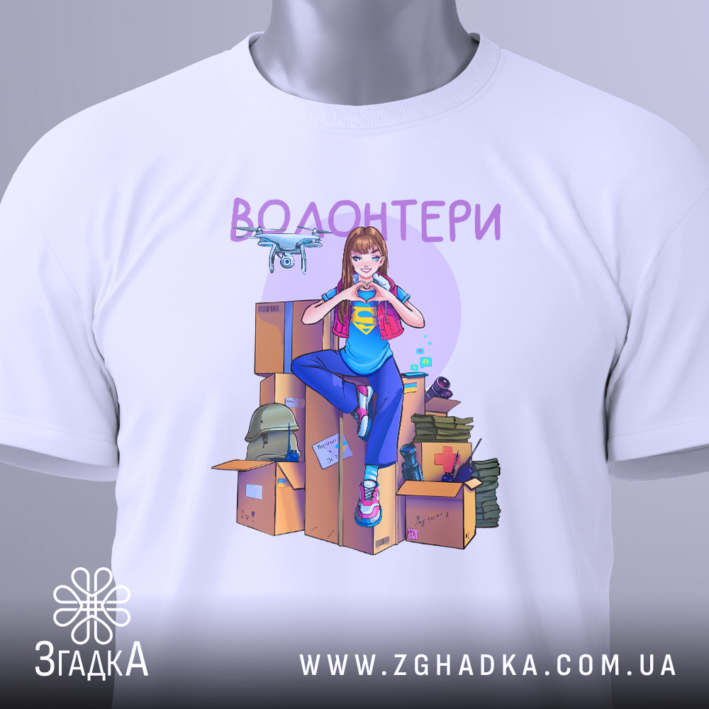 Ця футболка виготовлена з якісних матеріалів, що забезпечують комфорт і стиль. Принт символізує важливість волонтерської роботи та підтримку тих, хто потребує допомоги.