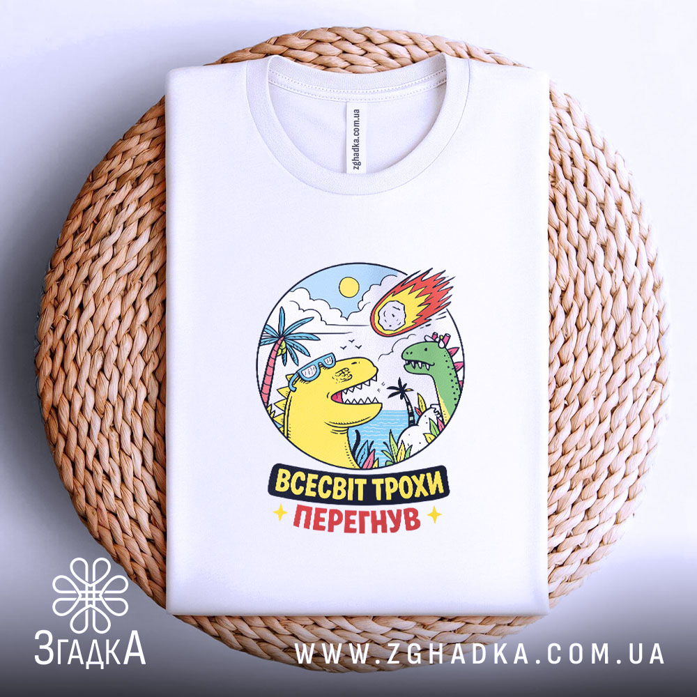 Футболка з принтом ‘всесвіт трохи перегнув’ стане яскравим акцентом вашого гардеробу. Вона поєднує стиль, комфорт та оригінальність.