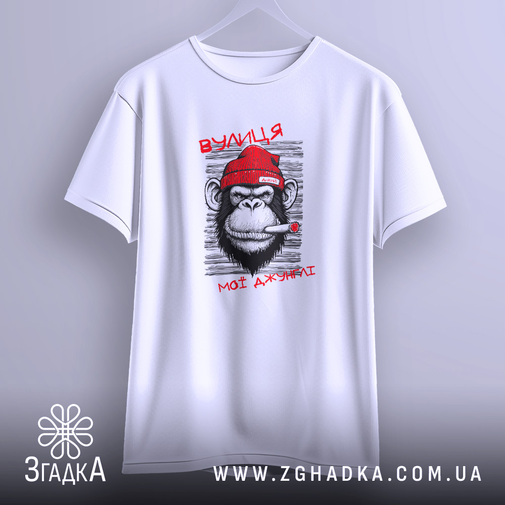 Футболка вулиця мої джунглі – це стильний одяг для активних людей. Яскравий принт та комфортний матеріал роблять її ідеальним вибором.