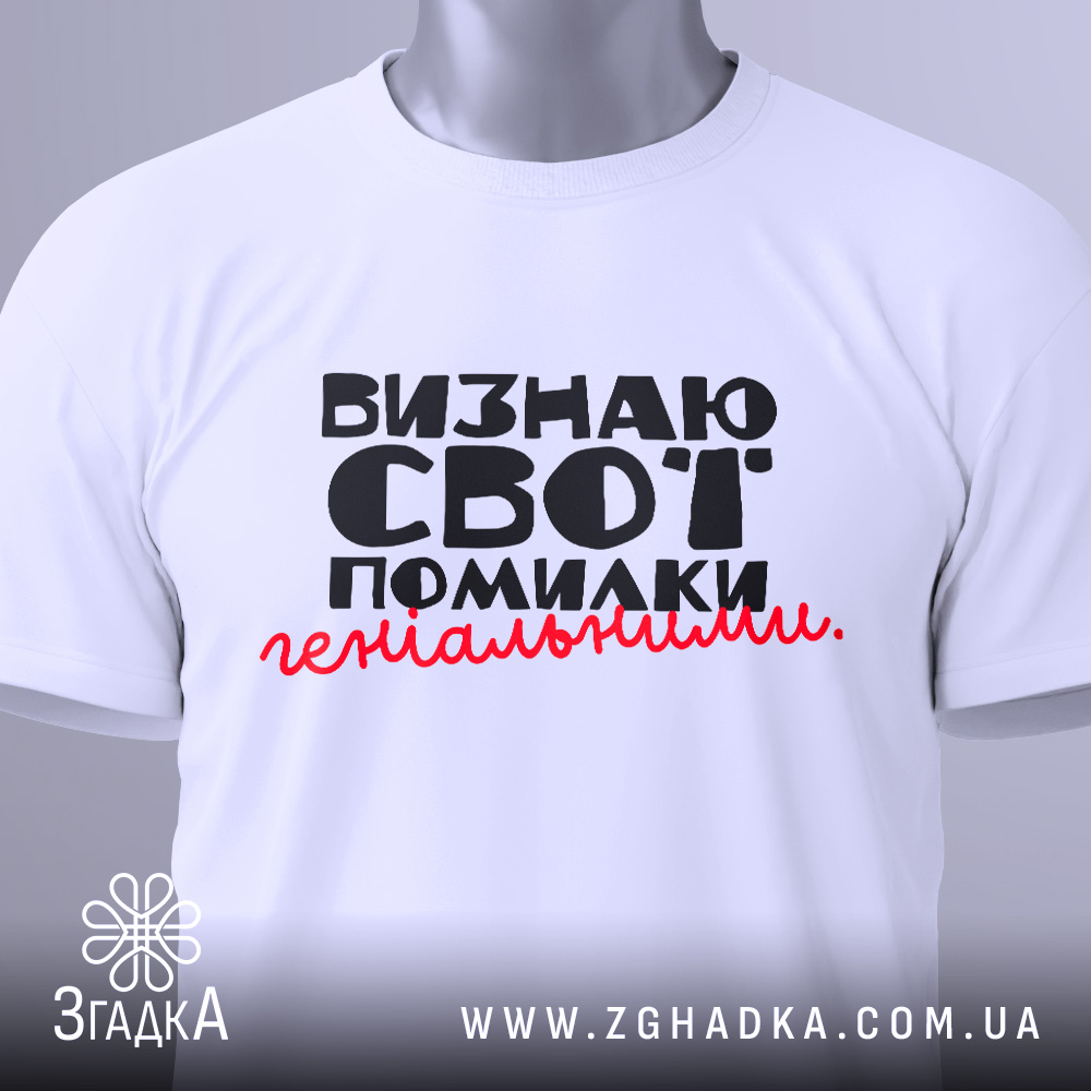 На принті футболки написано ‘Визнаю свої помилки’, що викликає позитивні емоції та спонукає до саморефлексії. Виберіть цю футболку, щоб підкреслити свою індивідуальність!