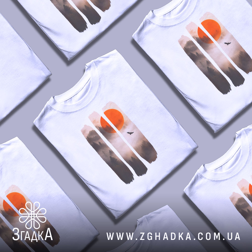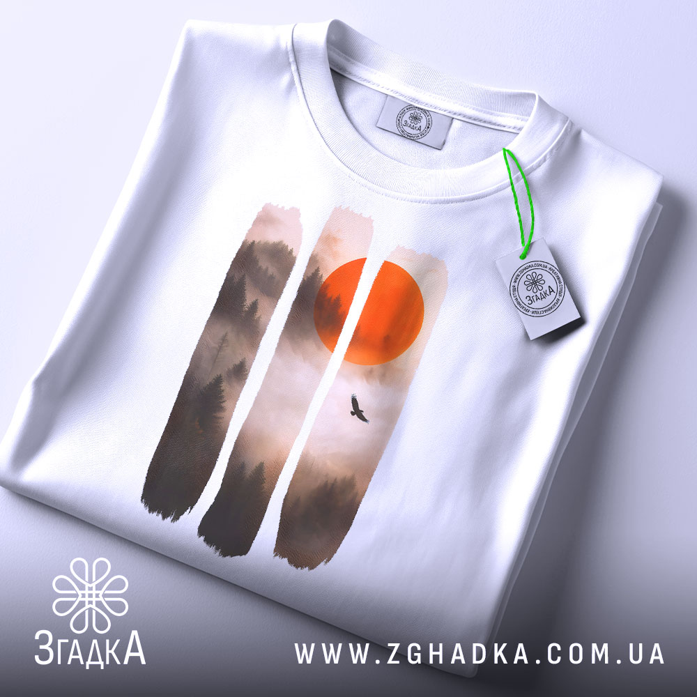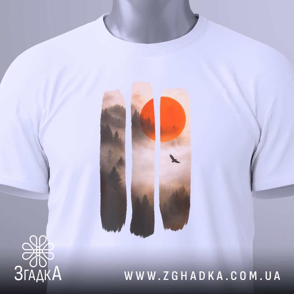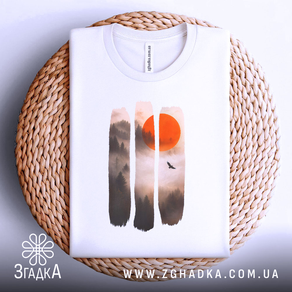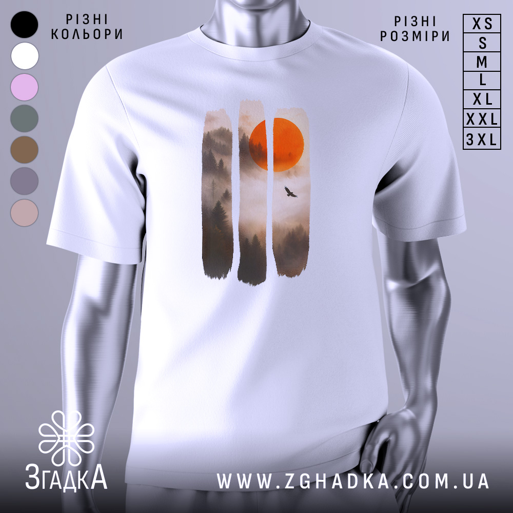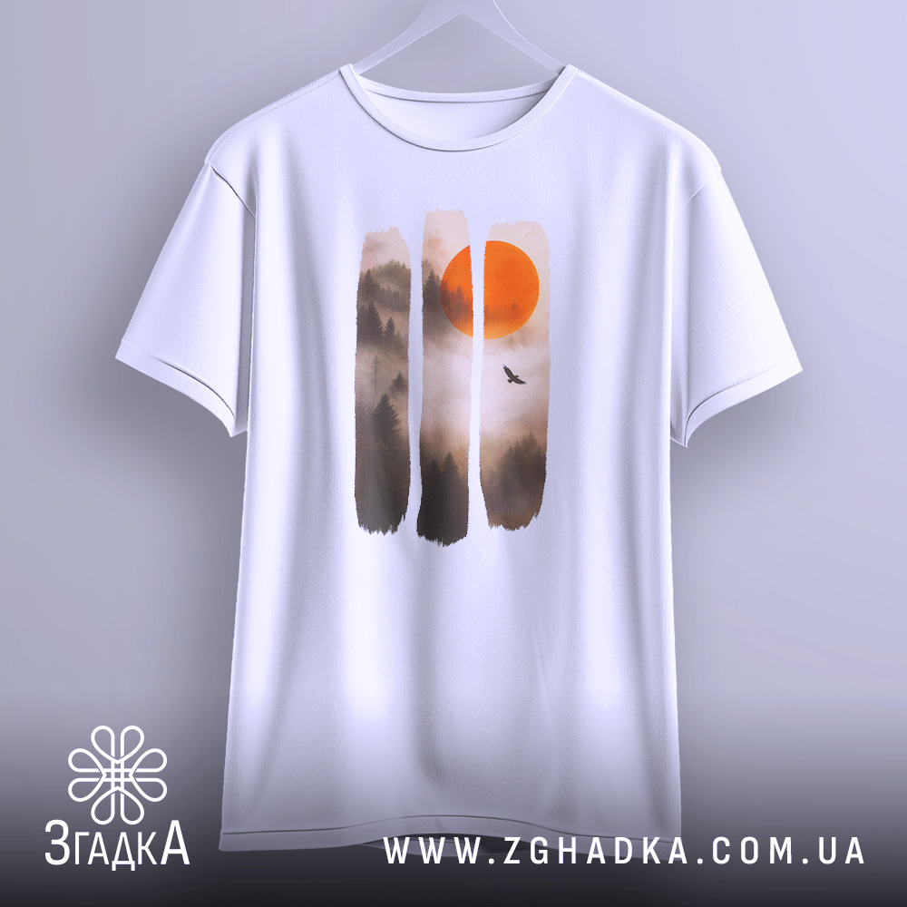 Футболка з принтом ‘захід сонця’ – ідеальний вибір для любителів природи. Стильний дизайн та комфорт гарантовані.