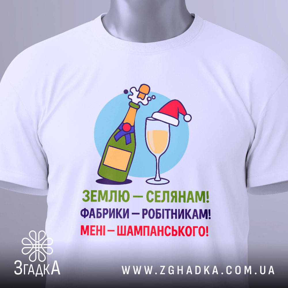 На принті зображено веселий жарт про шампанське, що викликає усмішку та піднімає настрій. Ідеально підходить для святкових моментів та дружніх зустрічей. Замовте свою футболку та розділіть радість!