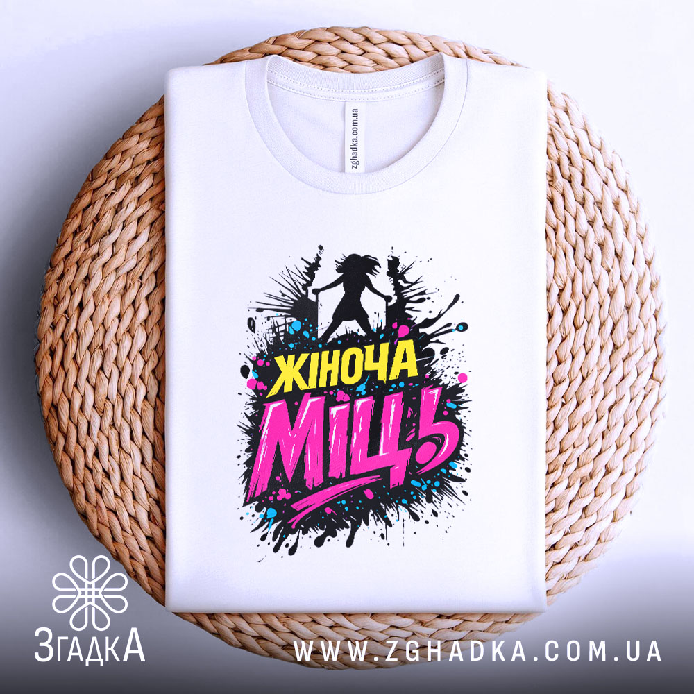 Футболка жіноча міць виготовлена з якісних матеріалів, що забезпечують комфорт. Принт на футболці говорить про вашу силу та індивідуальність, підкреслюючи ваш стиль.