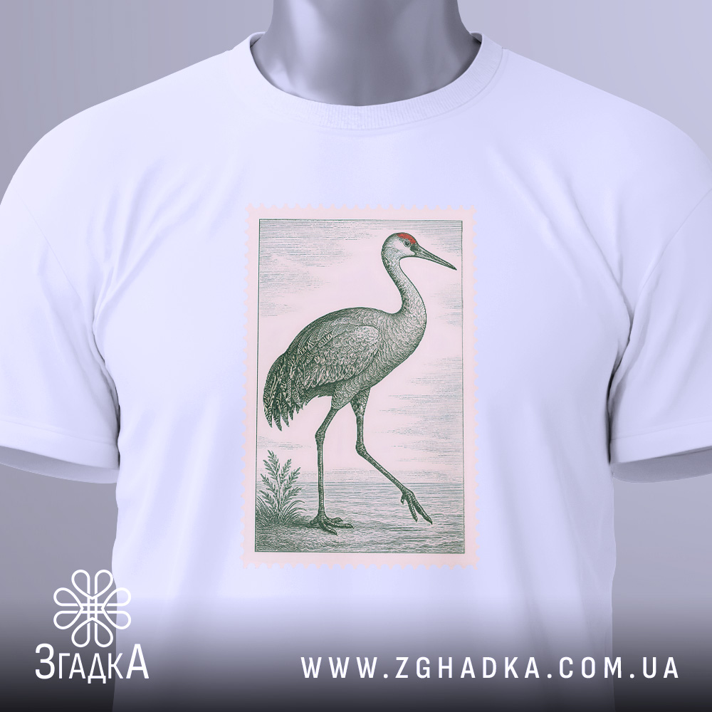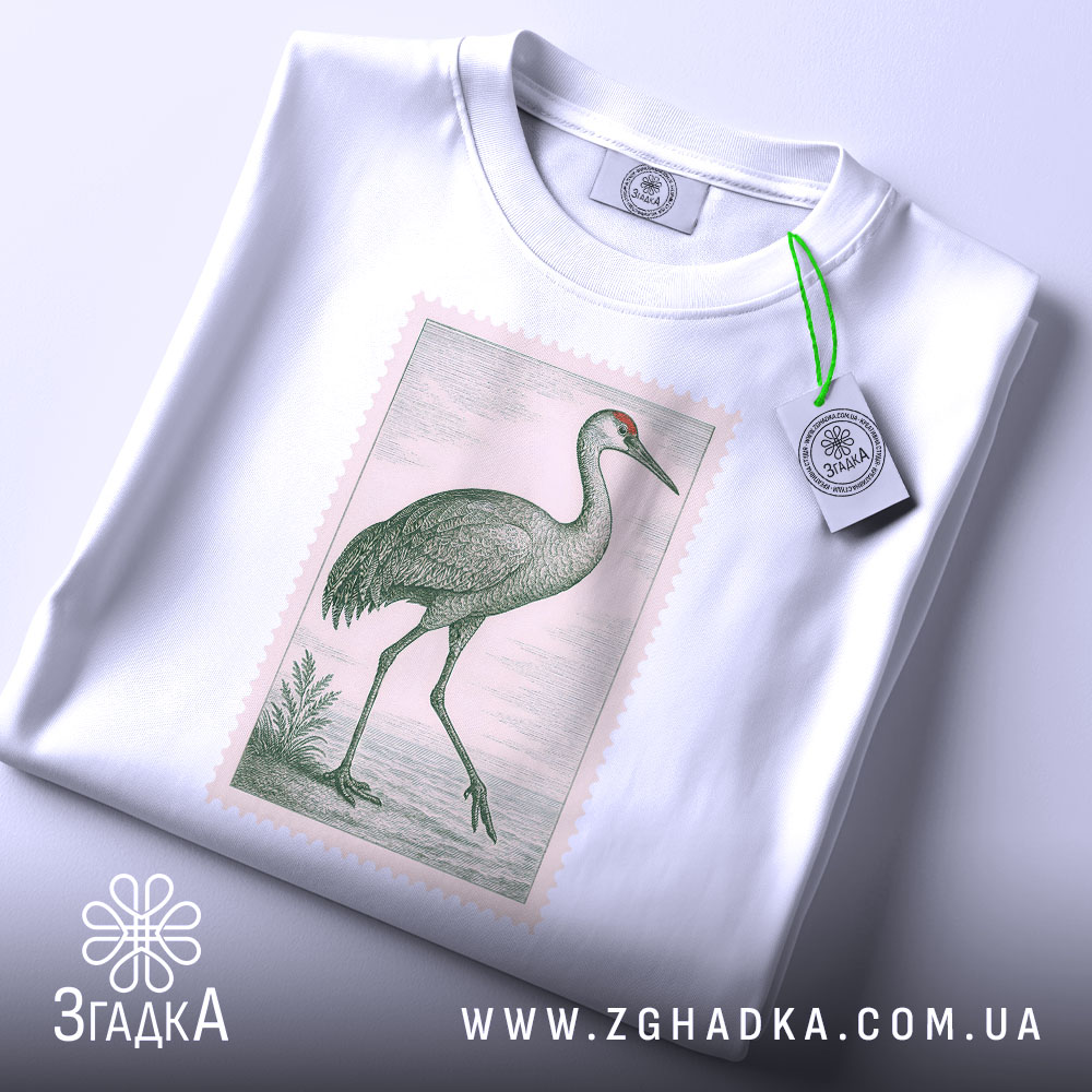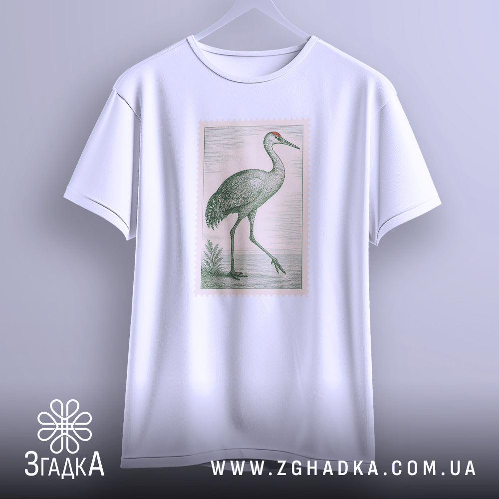 На принті зображений елегантний журавель, що символізує свободу та грацію. Ця футболка викликає позитивні емоції та підходить для будь-якого випадку. Обирайте стиль і комфорт!