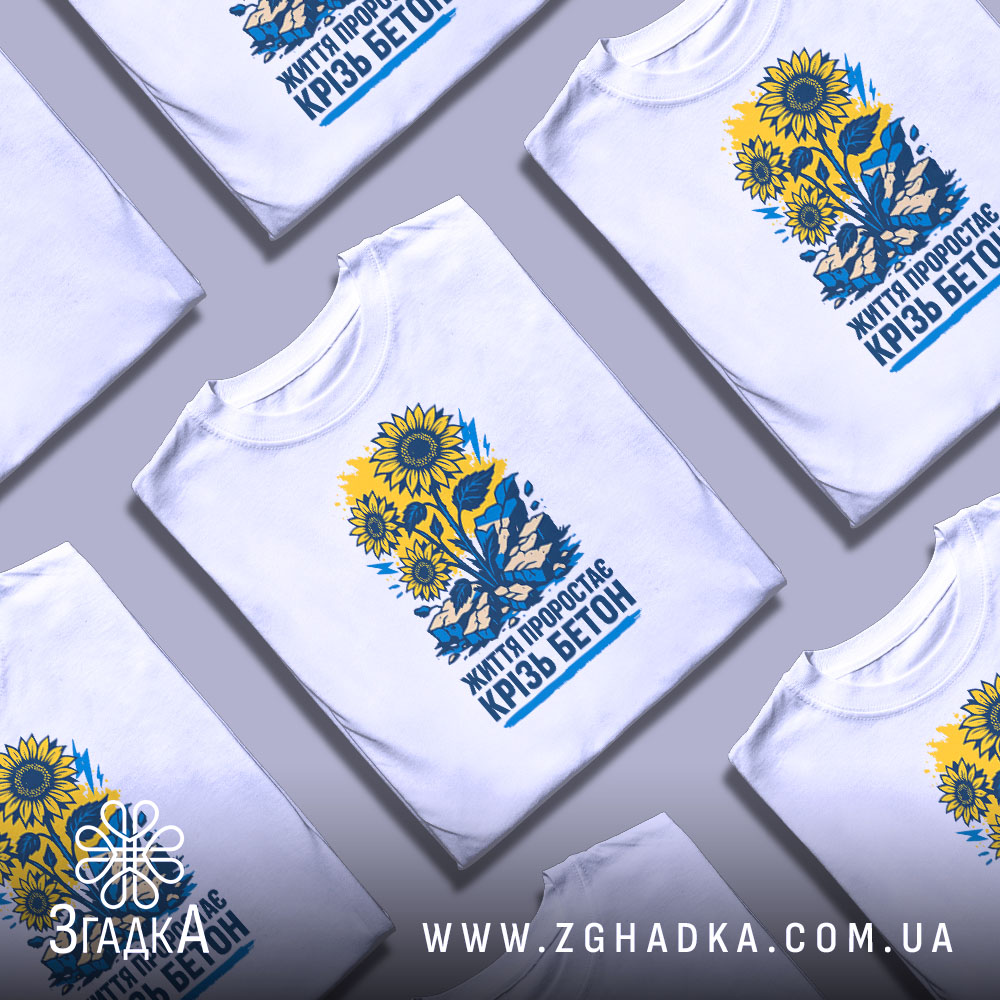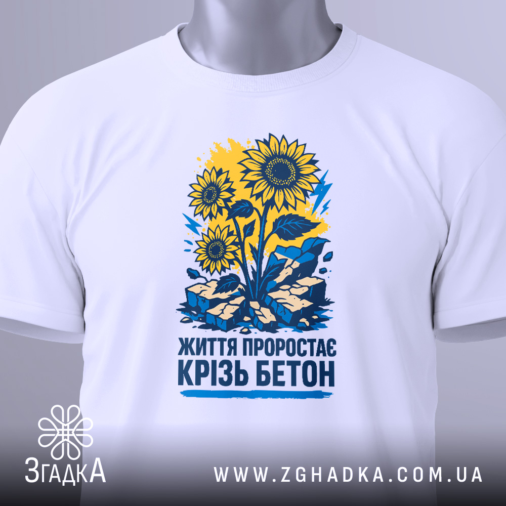 Футболка «Життя проростає крізь бетон» — це одяг, що говорить без слів. Принт із соняхами, які пробиваються крізь тріщини бетону, символізує українську стійкість, відродження та надію. Цей дизайн створений, щоб нагадувати: життя завжди перемагає навіть у найсуворіших умовах.