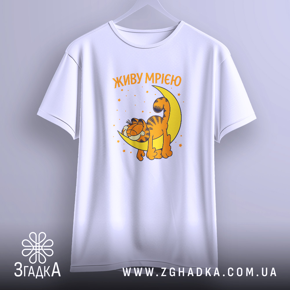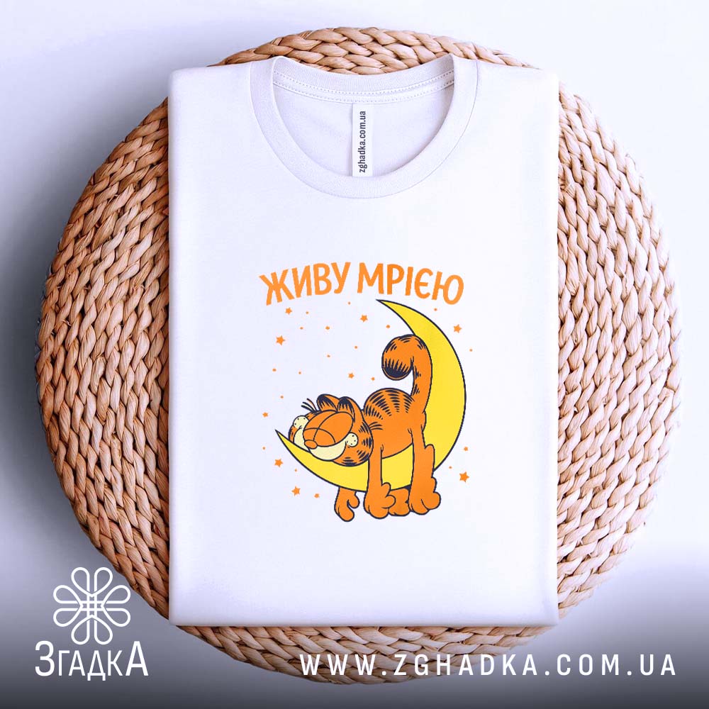 Котик, який мріє під місяцем, зірки навколо — це не просто принт, це емоція. Яскраві кольори, що підкреслюють настрій, створюють атмосферу радості. Напис ‘ЖИВУ МРІЄЮ’ виглядає як маніфест, закликаючи жити на повну.