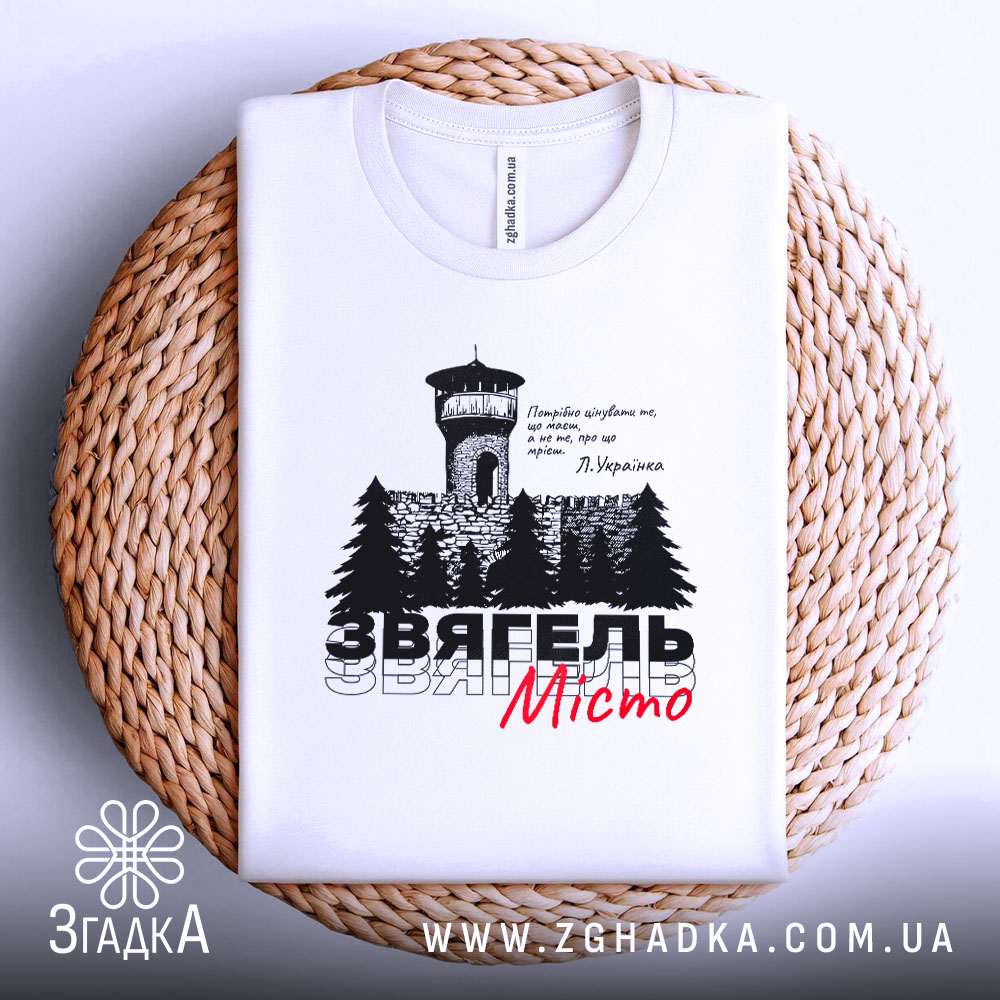 На принті зображено символи міста Звягель, що відображають його унікальність. Ця футболка поєднує стиль і комфорт, ідеально підходить для повсякденного носіння. Замовляйте зараз!