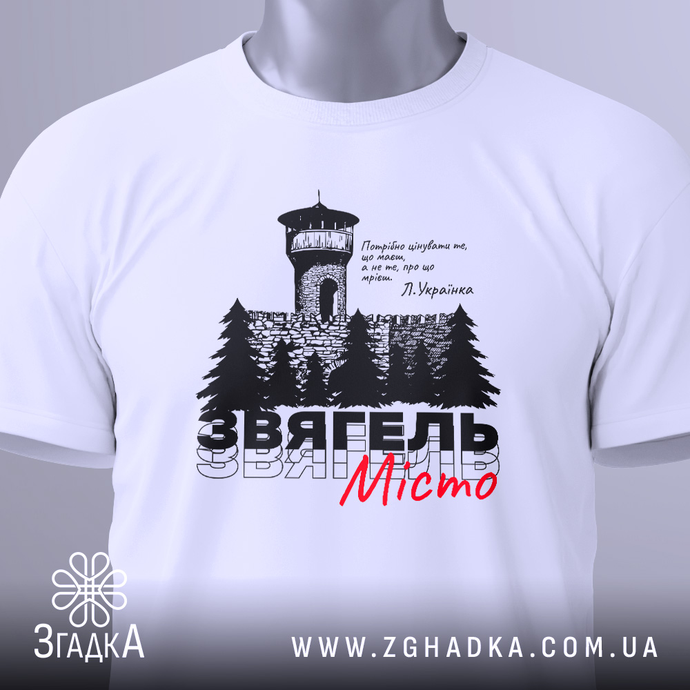 Футболка Звягель виготовлена з високоякісних матеріалів, що забезпечують комфорт протягом усього дня. Принт символізує гордість за рідне місто, що робить її не лише модним елементом, а й способом вираження своєї ідентичності.