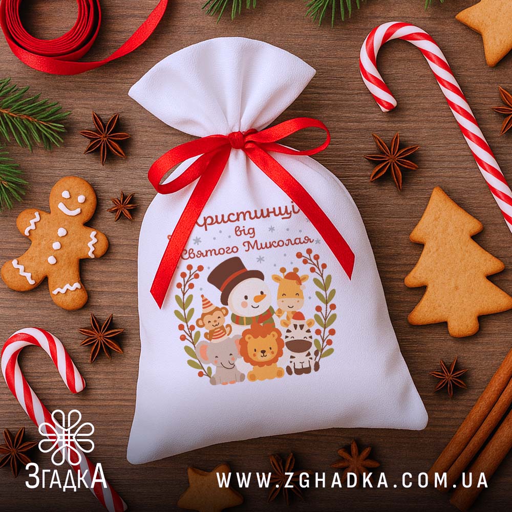 Іменна торбинка — це не просто паковання, а частина свята. Ніжний білий габардин підкреслює яскравість принта з зимовими героями, тваринками та святковими деталями. Безкоштовно додамо ім’я дитини чи коротке побажання — і подарунок стане по-справжньому особистим. Така торбинка створює інтригу ще до відкриття й виглядає ідеально на фото під ялинкою.