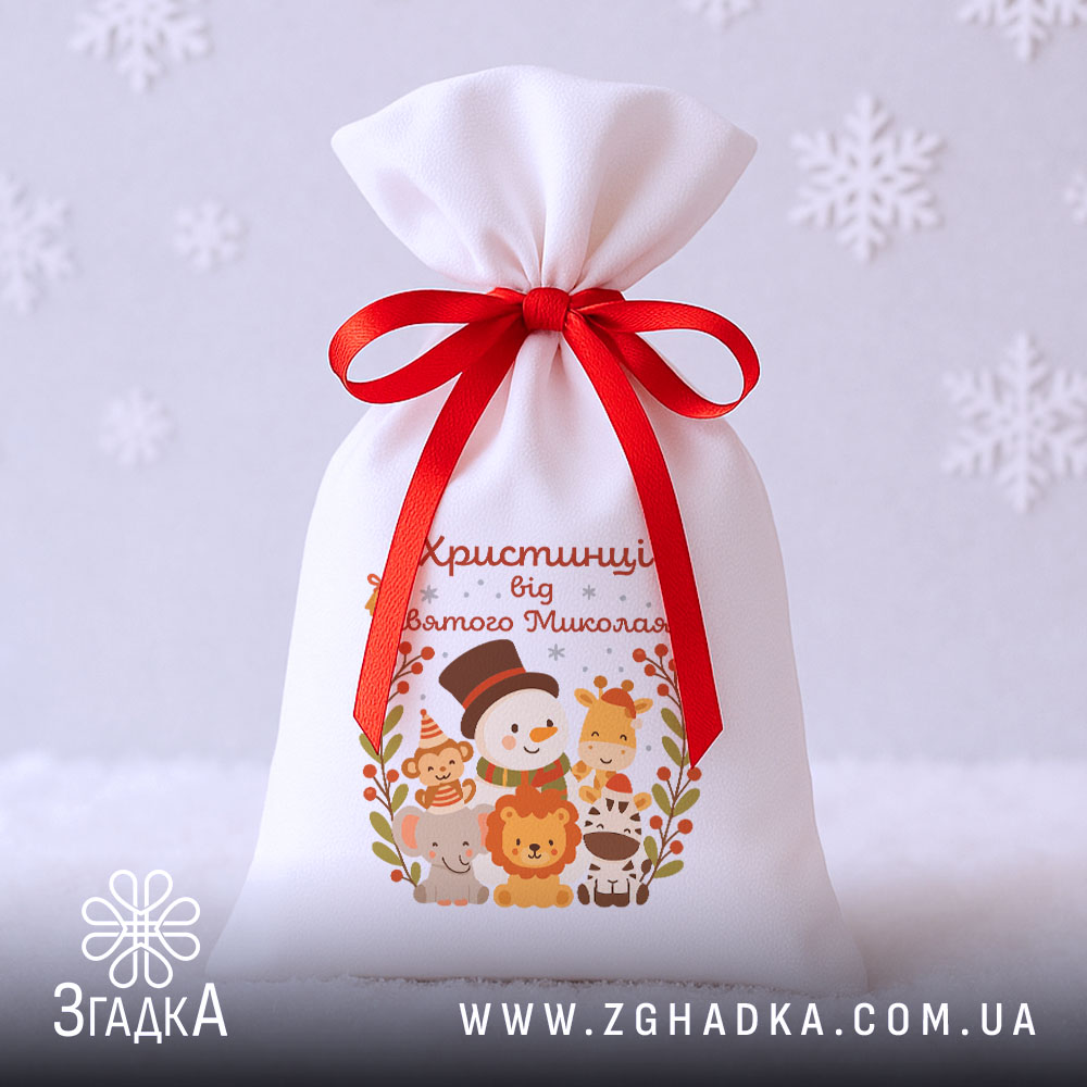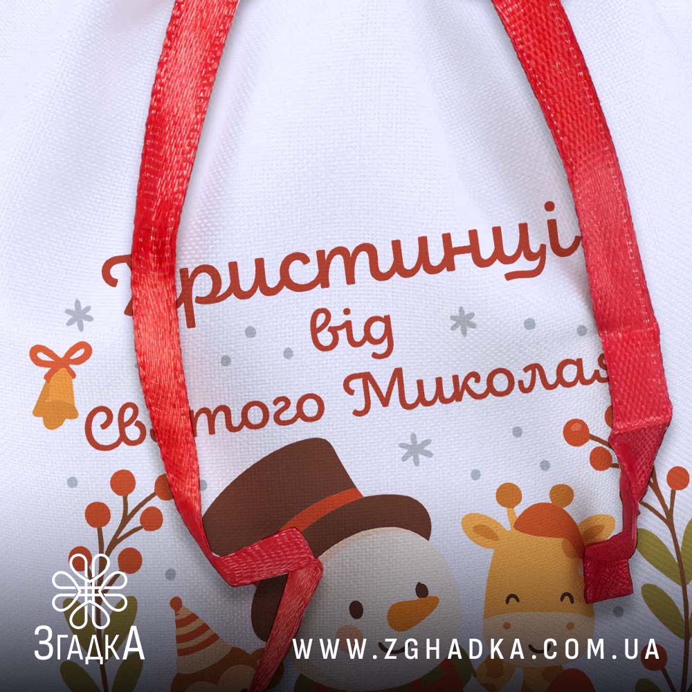 Розмір 20×30 см — універсальний для солодощів, дрібних іграшок, книжечки чи набору сюрпризів. Матеріал — щільний габардин, що добре тримає форму та приємний на дотик. Сублімаційний друк яскравий і стійкий до прання, не тріскається та не вицвітає. Атласна червона стрічка легко фіксує вміст і додає святкового акценту. Торбинку зручно використовувати багаторазово.