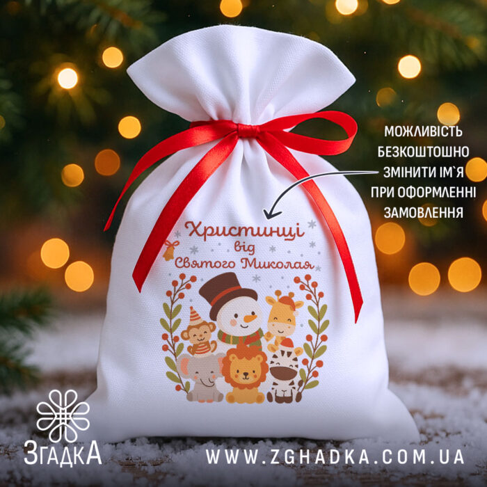 Іменна торбинка — це не просто паковання, а частина свята. Ніжний білий габардин підкреслює яскравість принта з зимовими героями, тваринками та святковими деталями. Безкоштовно додамо ім’я дитини чи коротке побажання — і подарунок стане по-справжньому особистим. Така торбинка створює інтригу ще до відкриття й виглядає ідеально на фото під ялинкою.