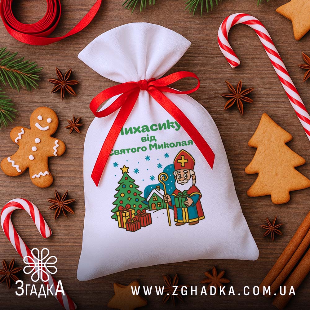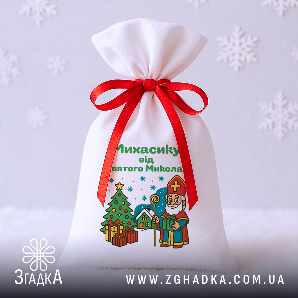 Наш іменний мішечок — це стильне та зручне паковання, яке одразу створює відчуття свята. Яскравий святковий принт зі Святим Миколаєм, ялинкою та подарунками дарує дитині магію очікування, а персоналізований напис робить подарунок унікальним. Торбинка легко зав’язується червоною стрічкою, надійно тримає вміст і виглядає естетично на фото та під ялинкою.