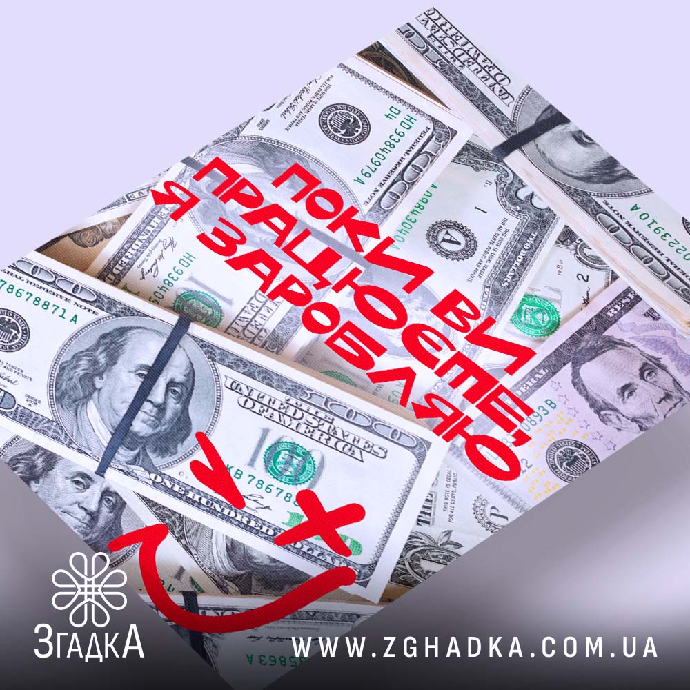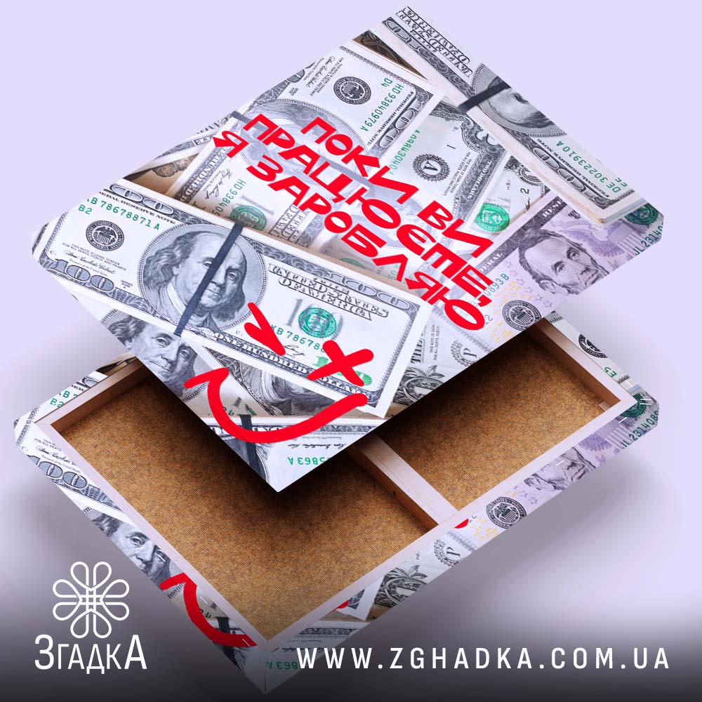 Яскравий холст, що передає енергію та впевненість. На ньому зображені купюри доларів, що символізують успіх, а червоний напис ‘Поки ви працюєте, я заробляю’ підкреслює амбіції. Композиція динамічна, кольори насичені та контрастні.