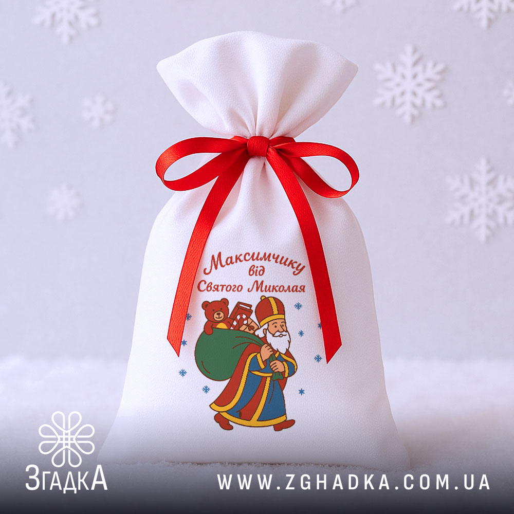 Іменний мішечок до Дня Миколая підкреслює турботу та створює інтригу подарунка ще до розпаковки. Це стильний і практичний аксесуар, що стане чудовим самостійним презентом.