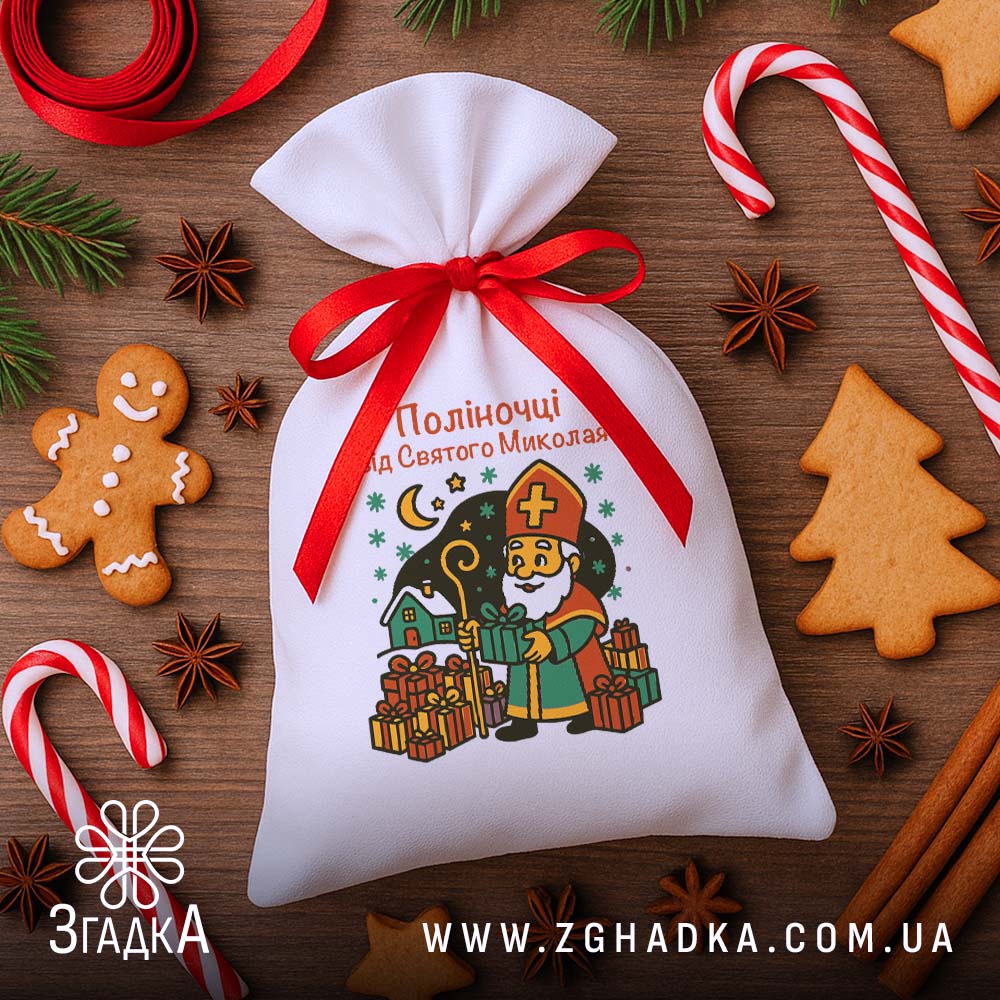 Іменний мішечок з щільного габардину перетворює подарунок на маленьке диво. Персоналізація і святковий принт створюють атмосферу очікування Миколая.