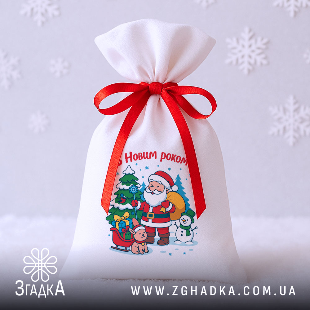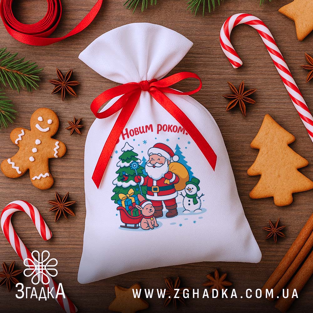 Мішечок виготовлений із щільного габардину та має зручний розмір 20×30 см. Міцна тканина добре тримає форму, не просвічується й виглядає охайно навіть після багаторазового використання. Білий колір основи чудово підкреслює насичені кольори новорічного принта, а червона стрічка додає святковості й завершеності композиції. Ідеальний варіант для пакування солодощів, іграшок, невеликих подарунків і навіть тематичних новорічних сувенірів.