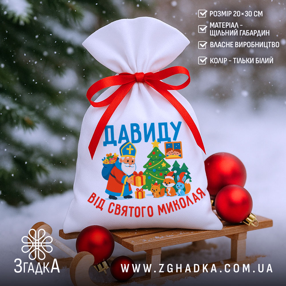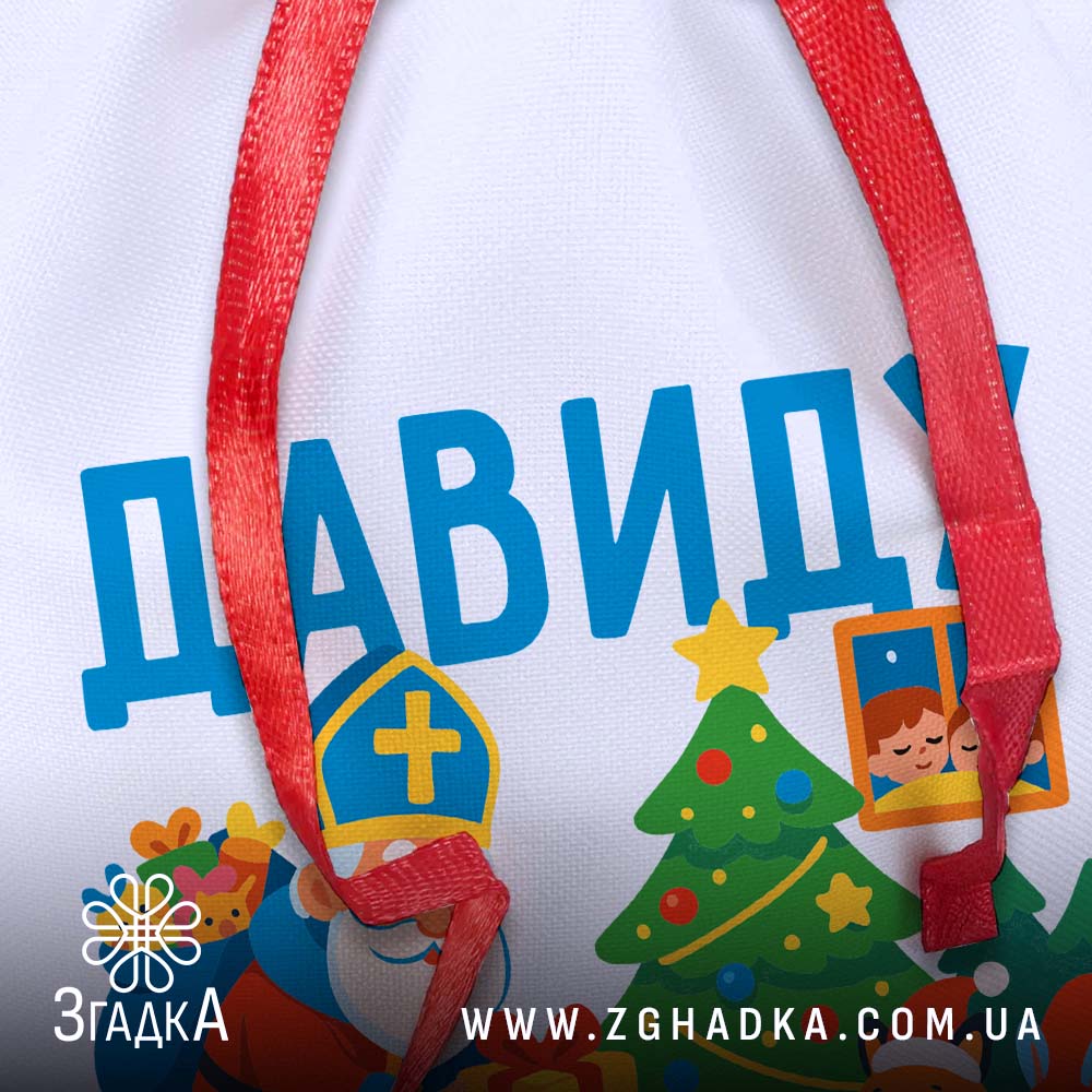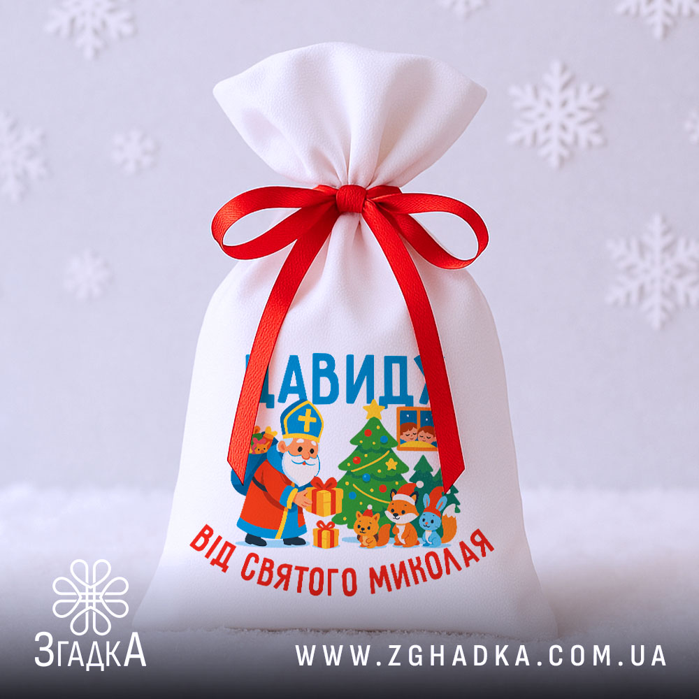 Мішечок подарунки Миколай створений для найтепліших моментів свята. Іменний дизайн, білий габардин та червона стрічка додають магії кожному подарунку.