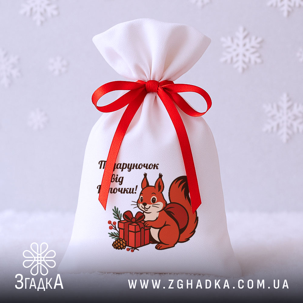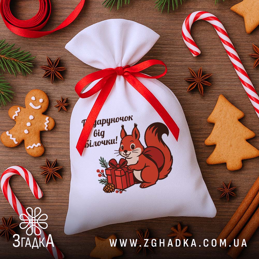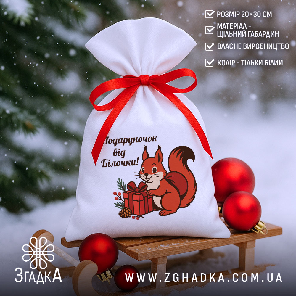 Мішечок подарунок від Білочки зробить ваш подарунок стильним, милим та по-справжньому святковим. Це чудова ідея для дітей, рідних, друзів і всіх, хто любить атмосферу новорічного дива.