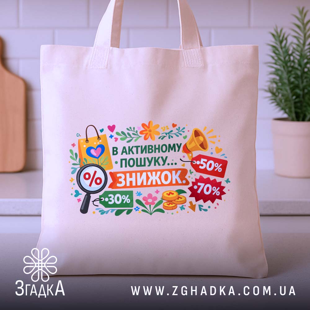 Шопер активного пошуку знижок – це стильний та екологічний вибір для щоденних справ. Витримує до 15 кг і виготовляється з якісних матеріалів.