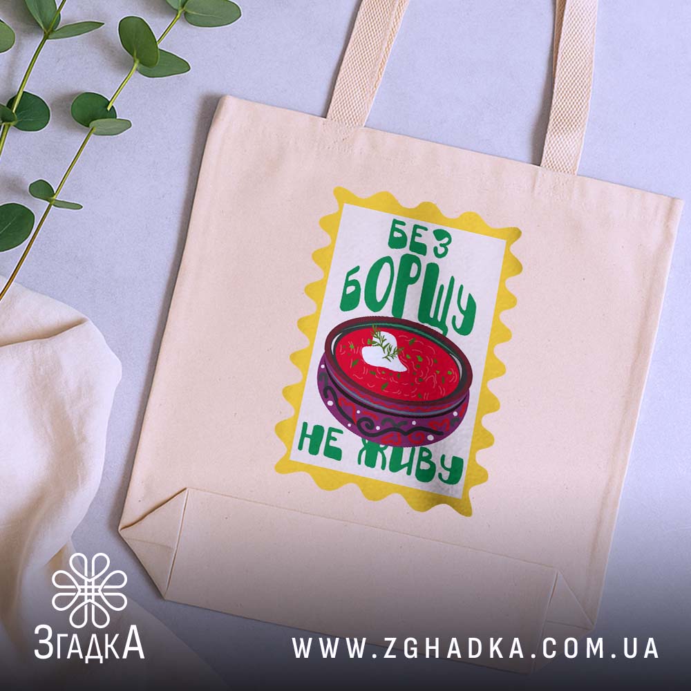 Стильний шопер з принтом ‘Без борщу не живу’ для щоденного використання. Виготовлений з якісних матеріалів, ідеальний для покупок.