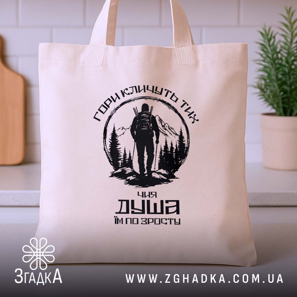 На нашому шопері з принтом ‘Гори кличуть’ відображено красу природи, що надихає на нові пригоди. Цей стильний аксесуар стане чудовим супутником у ваших подорожах, на прогулянках або в повсякденному житті.