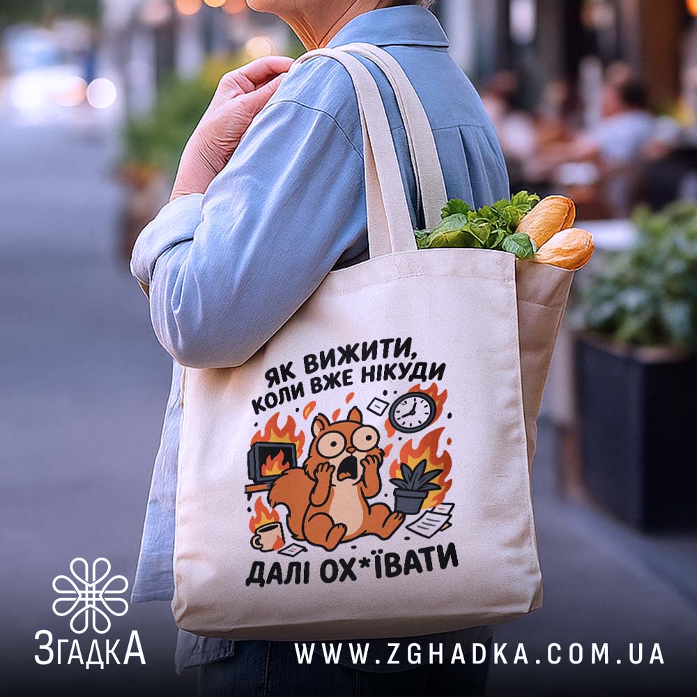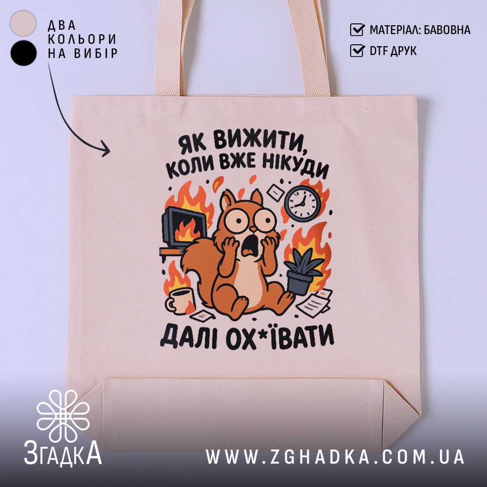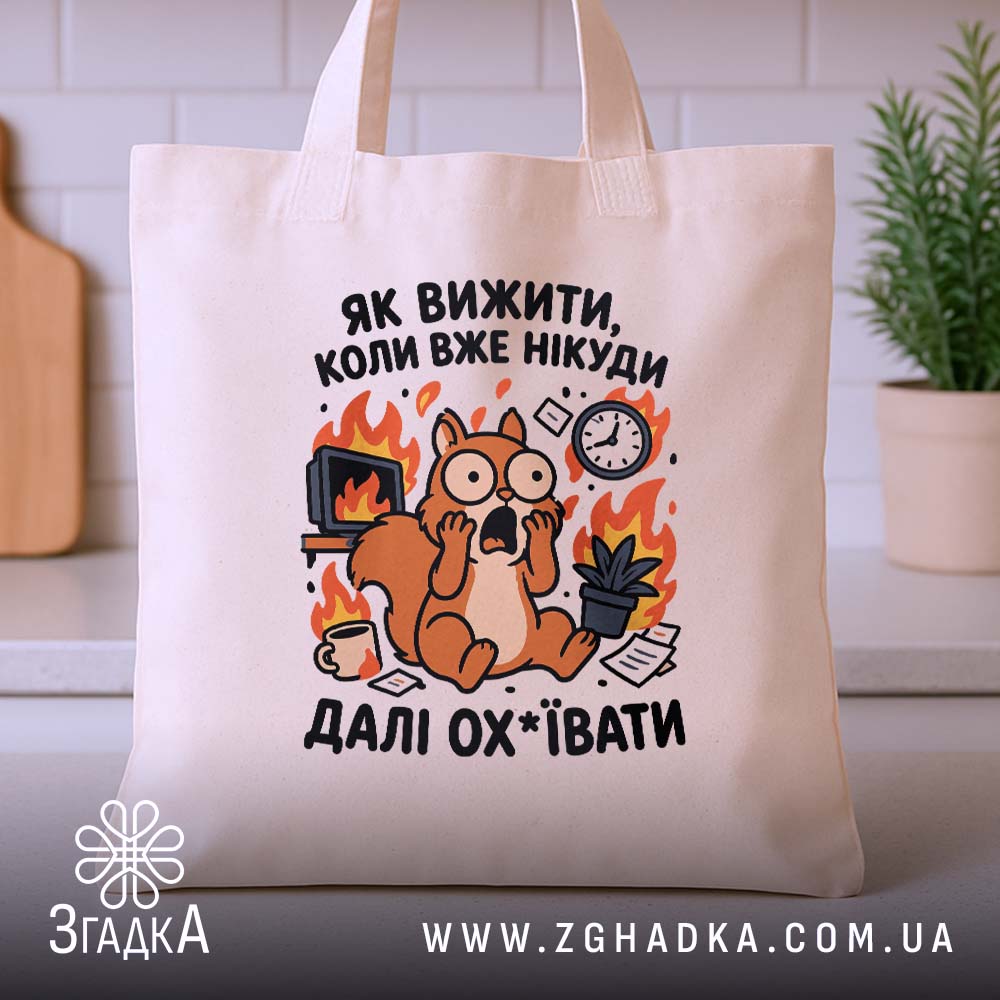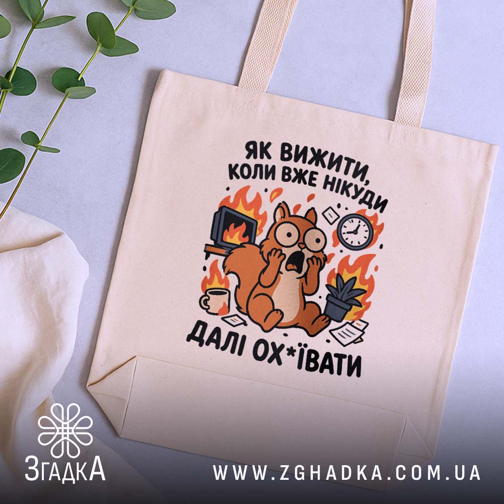 Яскравий принт, що зображує перелякану білку серед полум’я. Вона сидить на купі документів, оточена годинником і рослиною. Стиль коміксів, кольори насичені: помаранчеві вогні, коричнева білка, чорний текст. Напис виглядає як крик душі, що підкреслює емоційний стан.