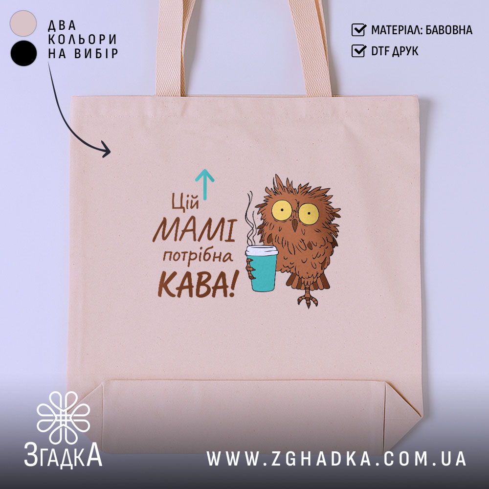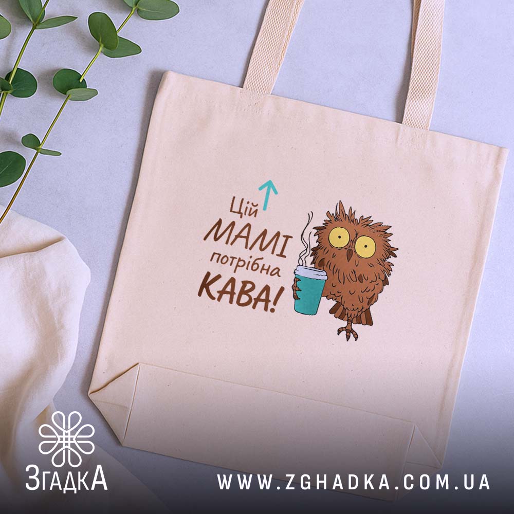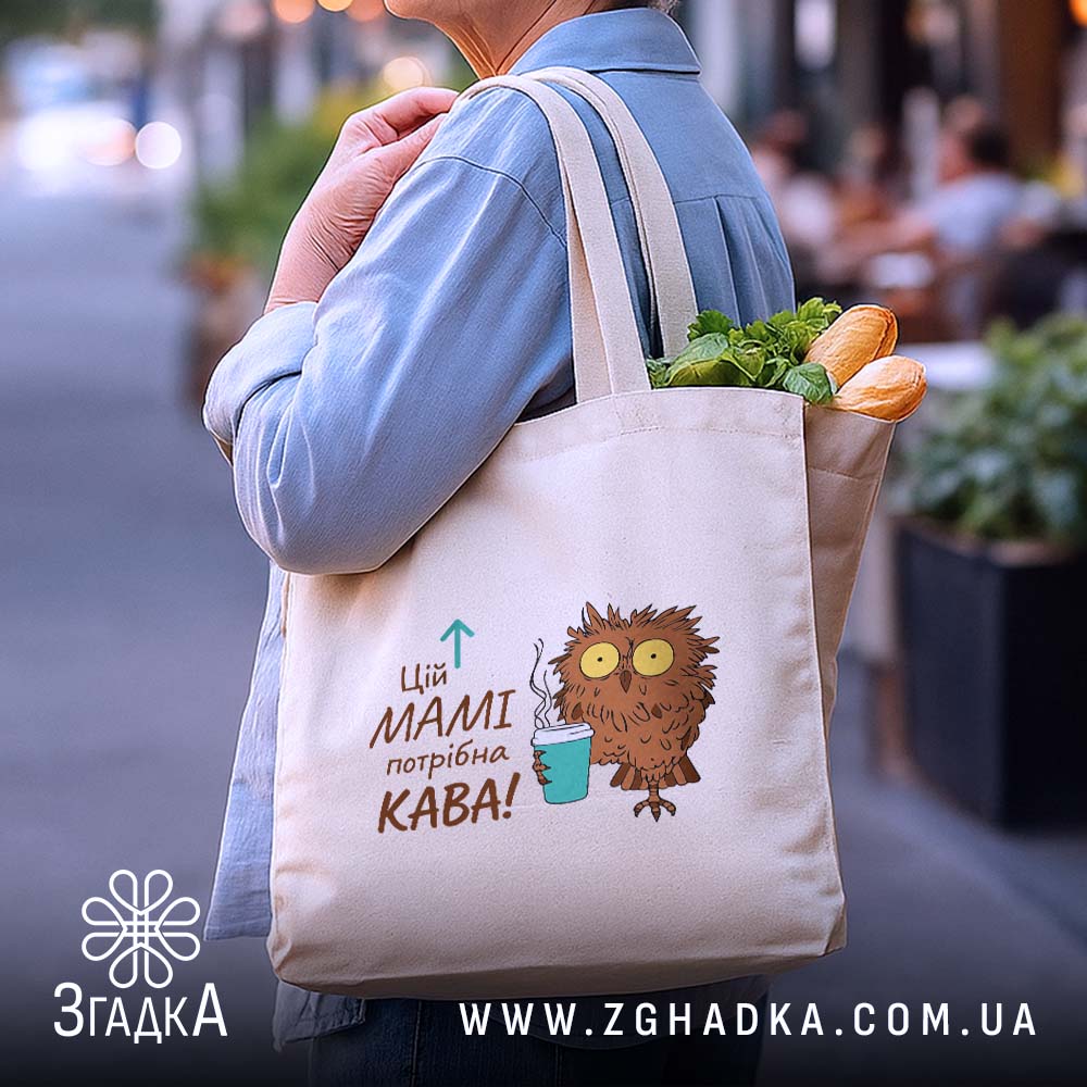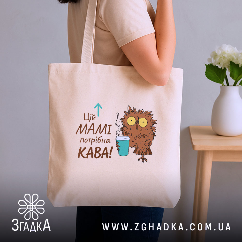 На шопері зображена милий совеня, що тримає чашку з гарячою кавою. Яскраві кольори та веселий стиль створюють позитивний настрій. Напис ‘Цій МАМІ потрібна КАВА!’ виглядає як запрошення до дії, підкреслюючи важливість кави в житті кожної мами.