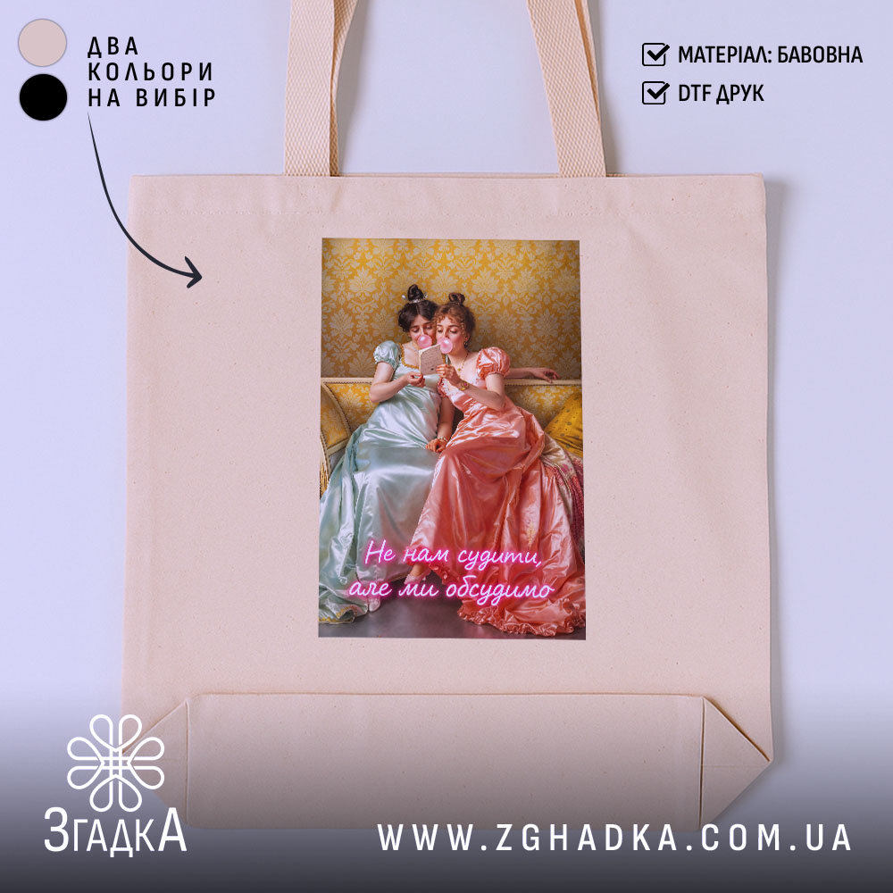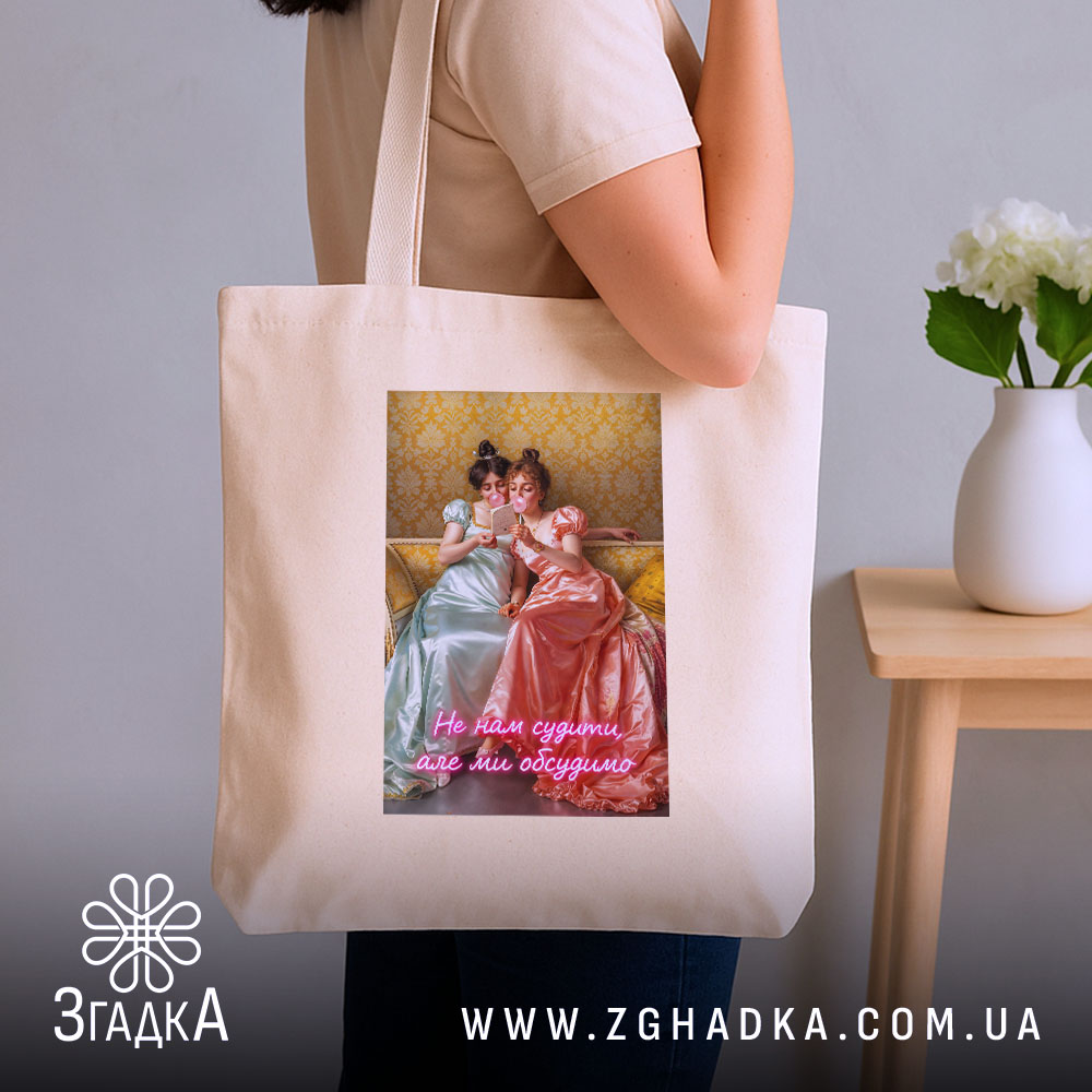 Цей шопер має унікальний принт, що відображає атмосферу затишного чаювання з подругами. Він стане чудовим аксесуаром для тих, хто цінує стиль і комфорт у повсякденному житті.