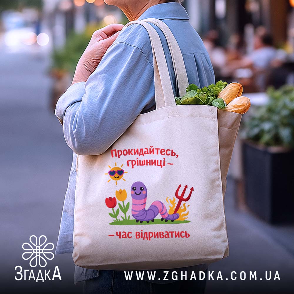 На шопері з принтом ‘Прокидайтесь грішниці’ відображено заклик до дії, що надихає на нові починання. Цей стильний дизайн створює позитивний настрій та підкреслює вашу індивідуальність.
