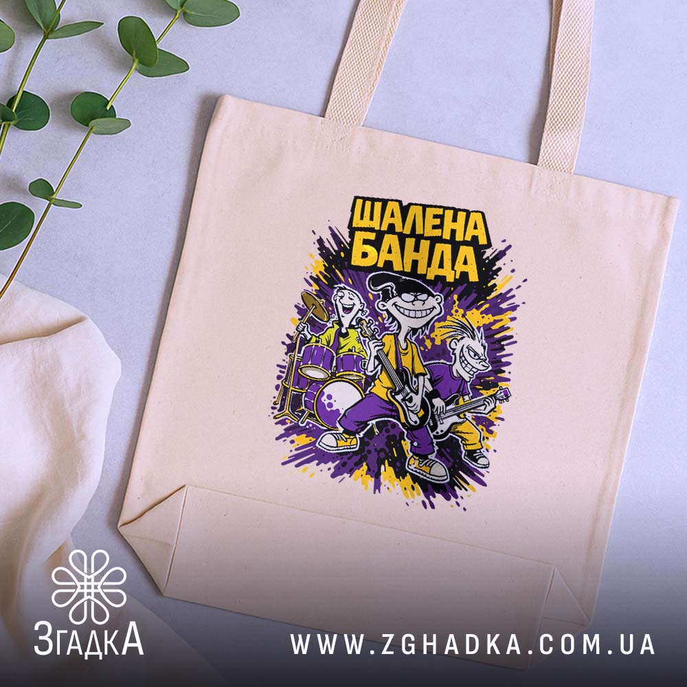 Стильний шопер з принтом ‘Шалена банда’ для щоденного використання. Доступний у бежевому та чорному кольорах, виготовлений з якісних матеріалів.