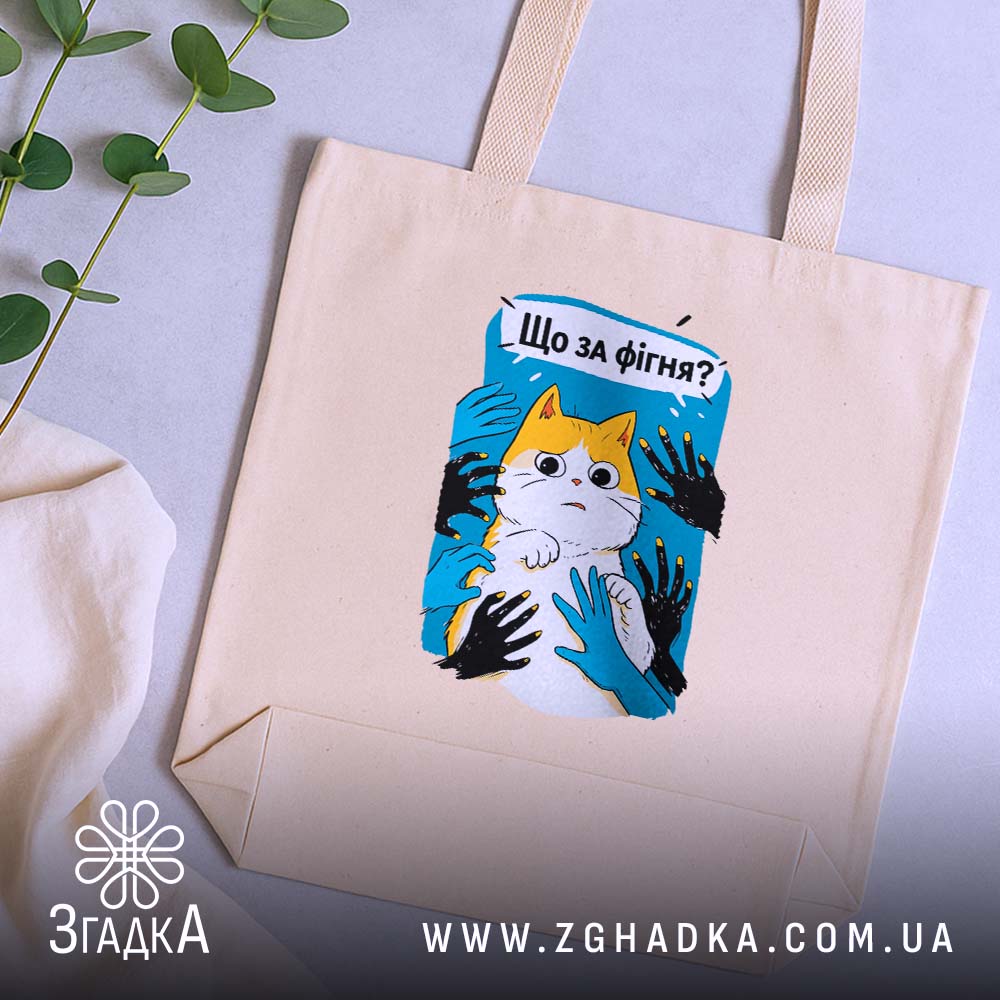 На шопері зображено мем з котом, який викликає усмішку та позитивні емоції. Цей принт стане чудовим доповненням до вашого стилю та підкреслить вашу індивідуальність.