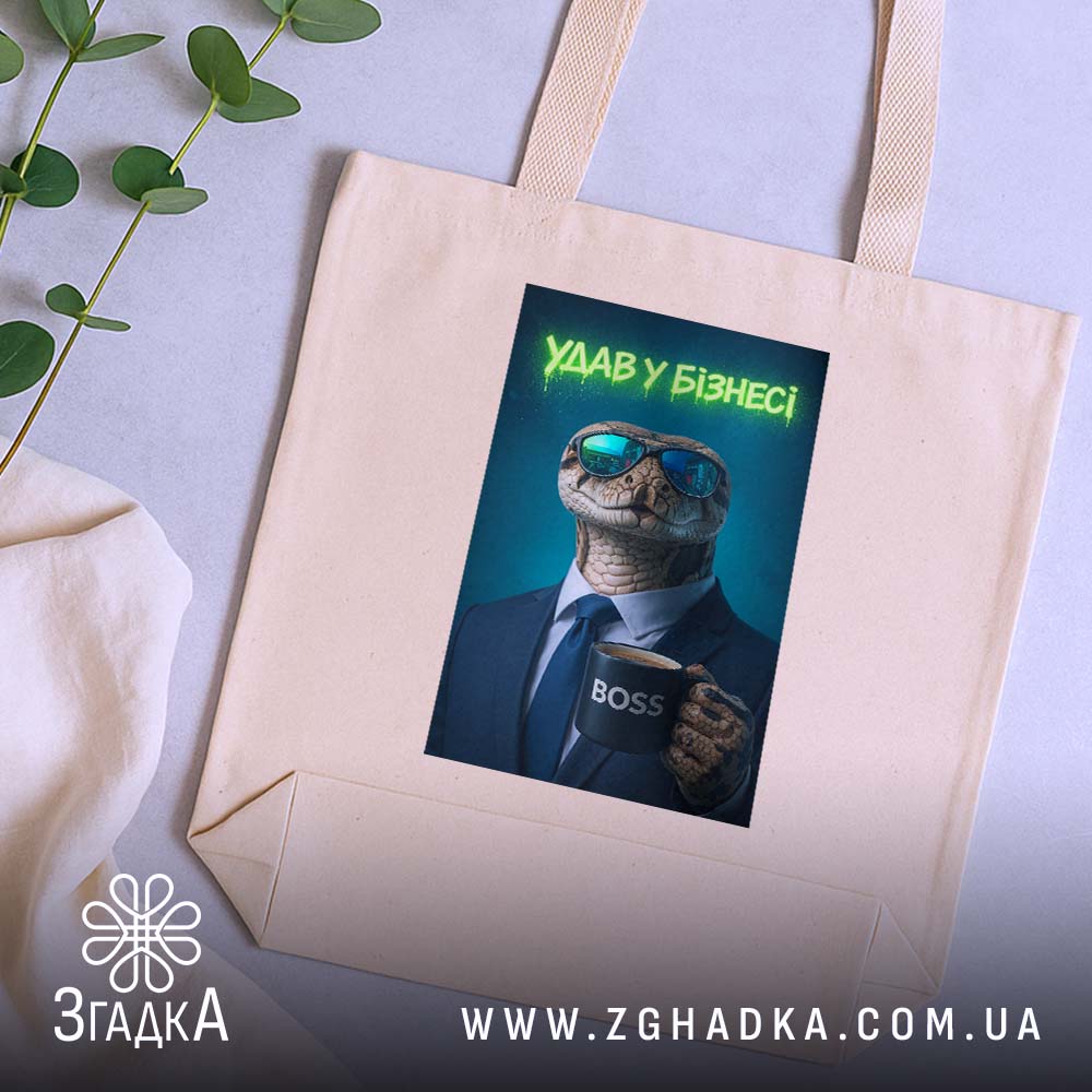 На шопері з принтом зображено стильний удав, що символізує впевненість та успіх у бізнесі. Цей дизайн надихає на нові досягнення та підкреслює ваш унікальний стиль.