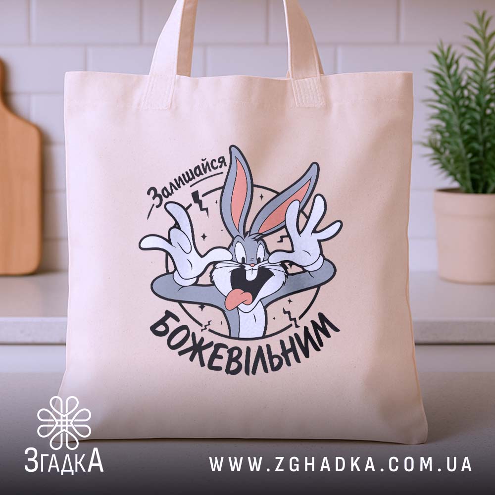 На шопері з принтом ‘Залишайся божевільним’ виражено креативність та позитивний настрій. Цей дизайн надихає на сміливі рішення та підкреслює вашу унікальність.