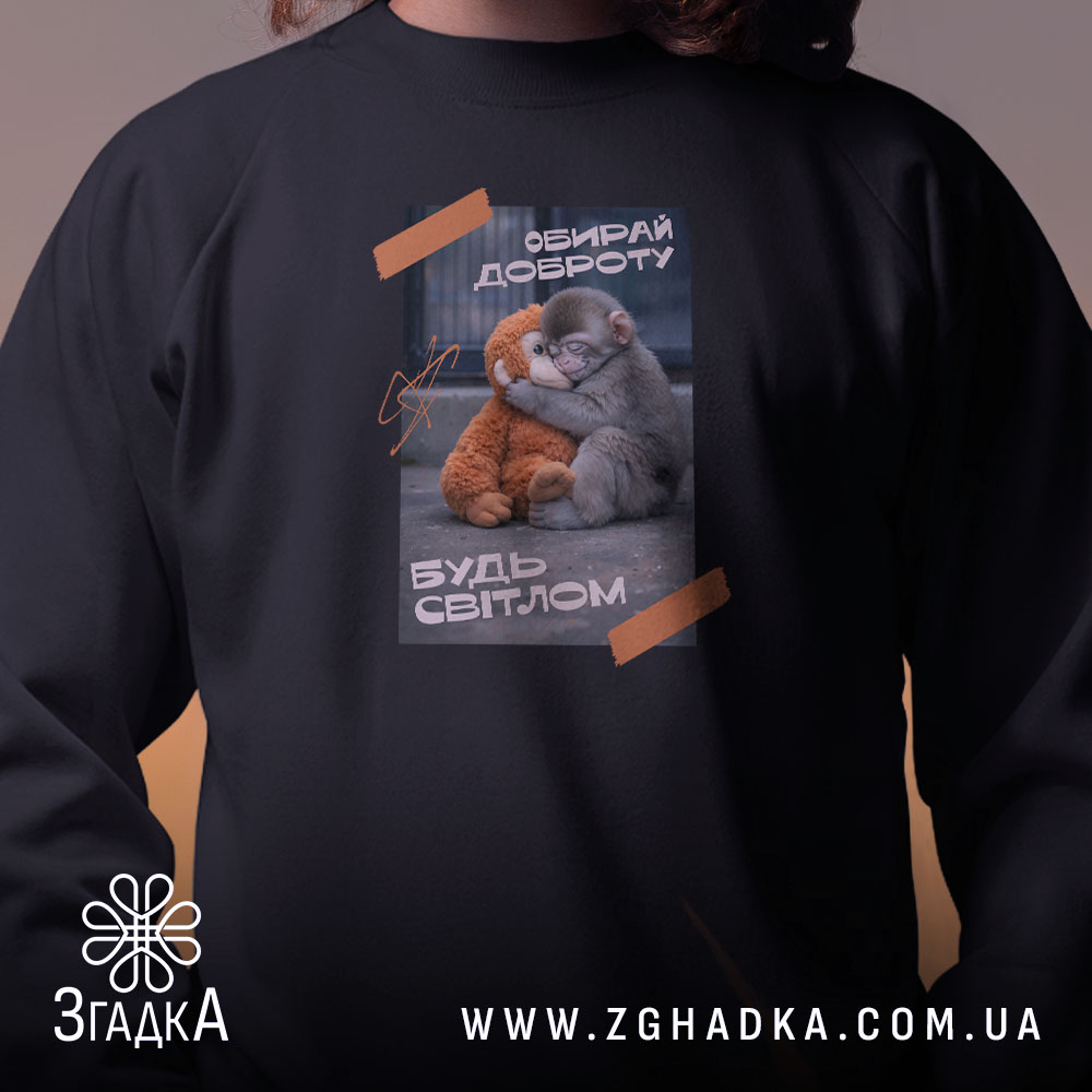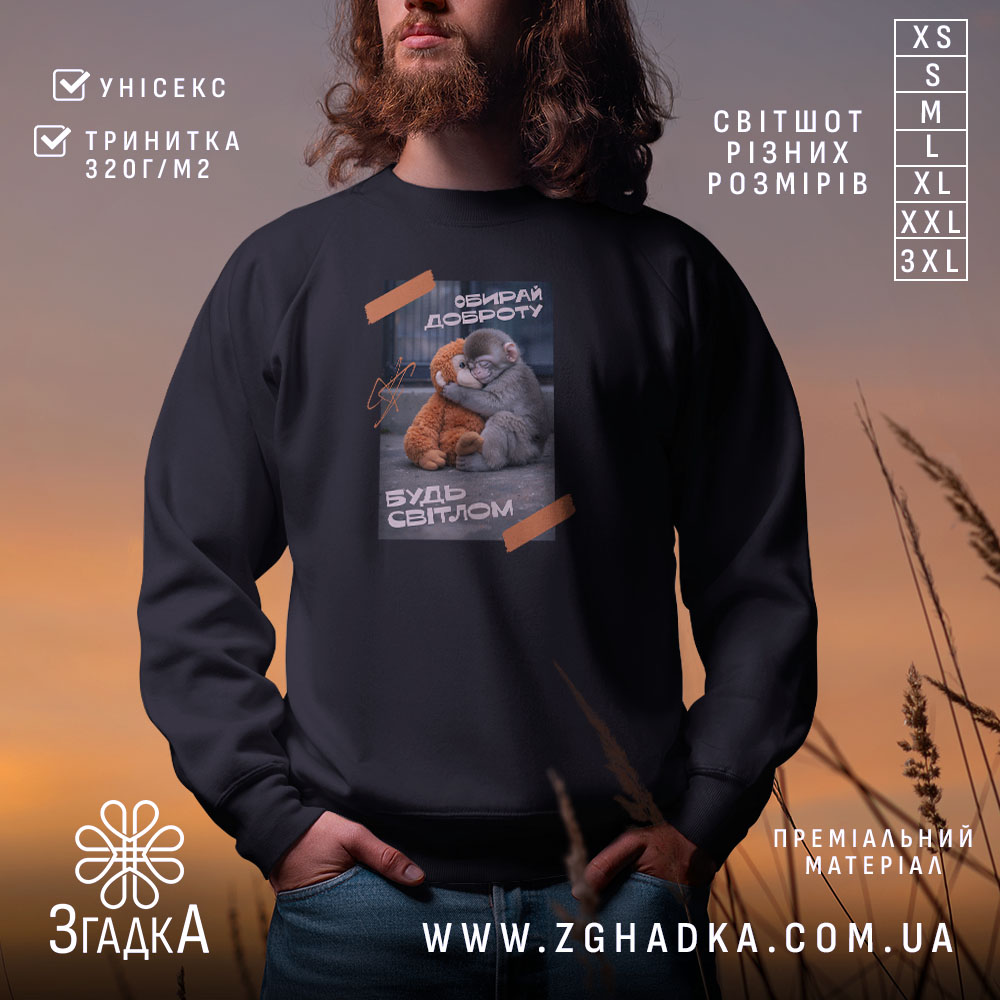 Світшот прикрашений унікальним принтом, який закликає обирати доброту. Цей дизайн не лише стильний, але й надихає на позитивні вчинки.
