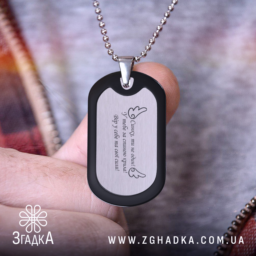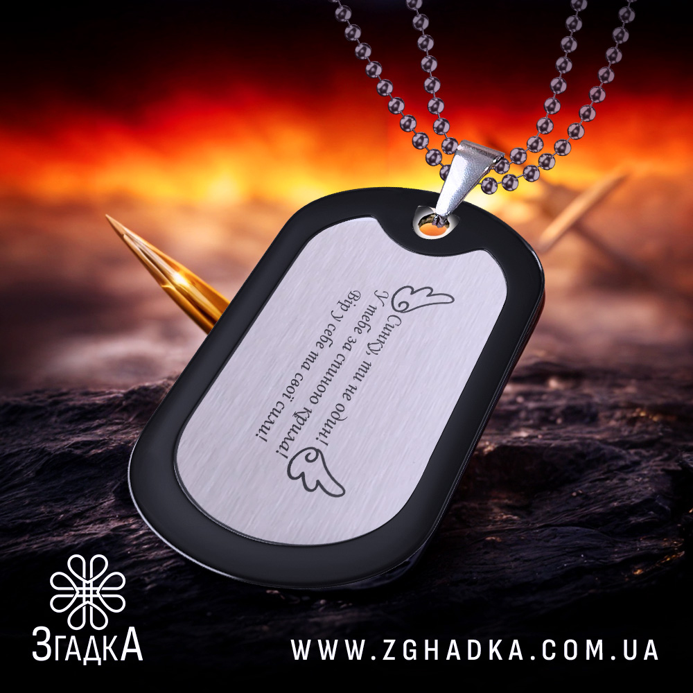 Жетон виготовлений з високоякісної нержавіючої сталі, що забезпечує його довговічність. Напис або символ на ньому можуть мати особливе значення, нагадуючи про важливі моменти в житті.