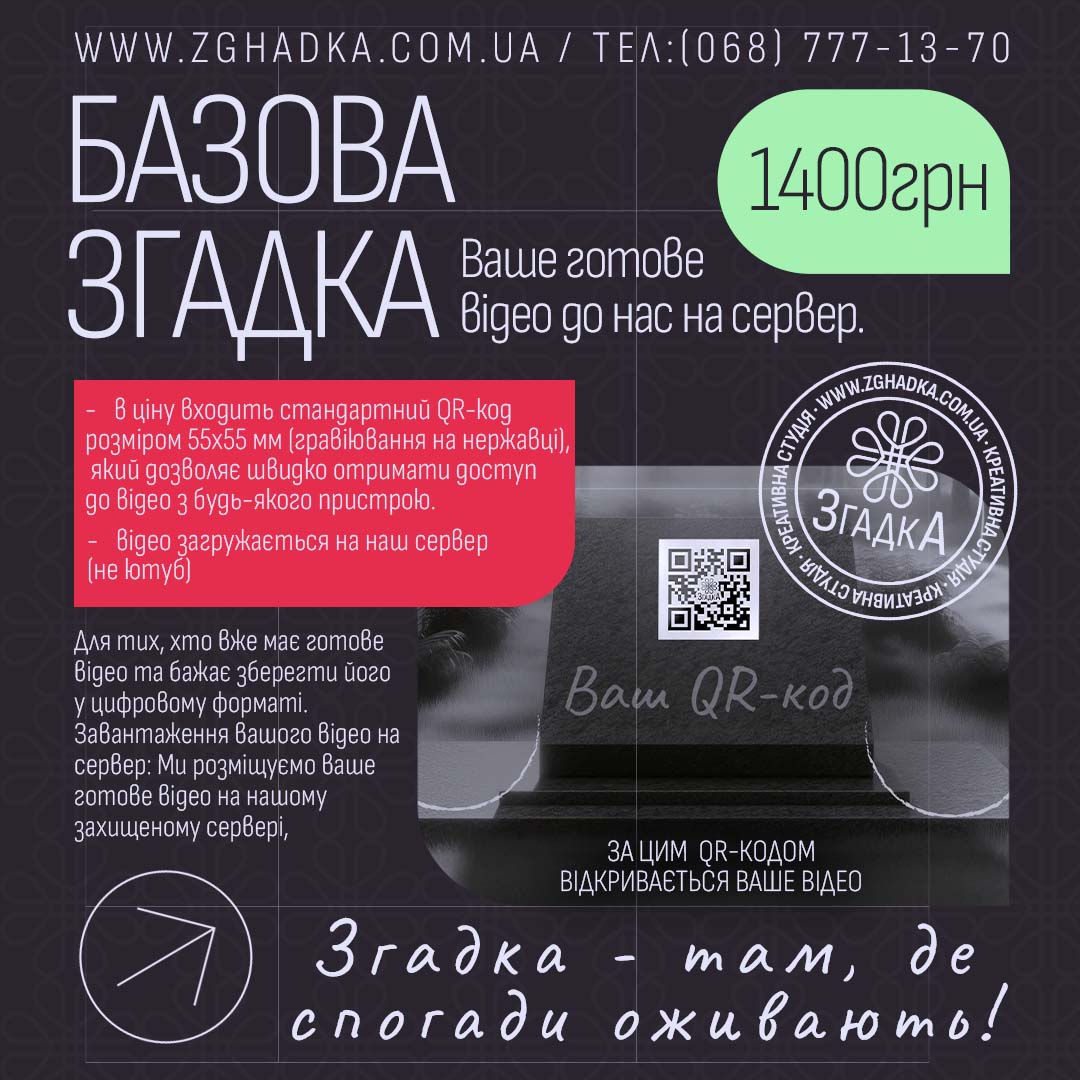 Ваше вже готове відео розміщуємо на нашому сервері й надаємо швидкий доступ за QR-кодом. Збереження без YouTube. Зручно для перегляду рідним. В ціну входить стандартний QR-код розміром 55x55 мм (гравіювання на нержавці), який дозволяє швидко отримати доступ до відео з будь-якого пристрою. Надійне збереження інформації, доступне лише вам та обраним особам в кого є доступ до QR-коду. Відео загружається на наш сервер (не ютуб).